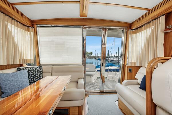 Entering the salon through the stainless steel bi-fold door, one is impressed with the spacious and light-filled interior. The teak and holly sole, exquisite cherry joinery and abundance of hand holds are located throughout the vessel.