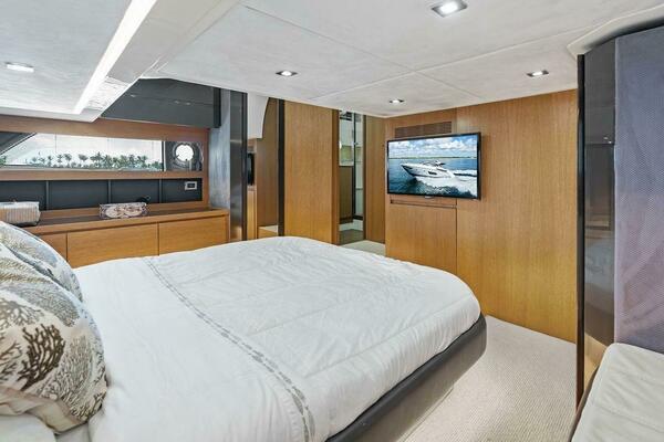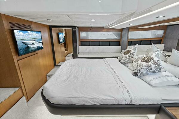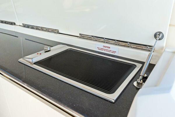 Her cockpit is a true social hub, complete with air conditioning, retractable soft top, teak side decks, teak table, and an entertainment center with audio/video, grill, and icemaker. Ideal for hosting family and friends. The tender lift platform and concealed electro-hydraulic gangway provide seamless access to the water, while sunpads forward and aft invite relaxation.