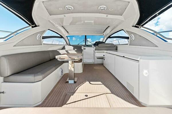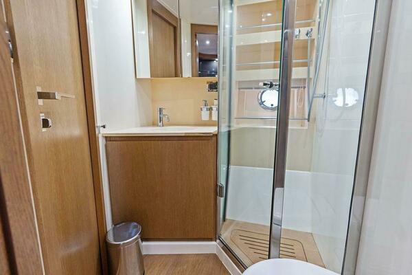 Below deck, the contemporary décor highlights a bright salon with convertible dinette, additional 100-liter refrigerator, and fully equipped galley. Accommodations include two staterooms—an en-suite master and a spacious VIP, plus the convertible dinette, and comfortably sleeping up to six guests. Every detail reflects Azimut’s signature craftsmanship, from fine wood finishes to thoughtful storage.