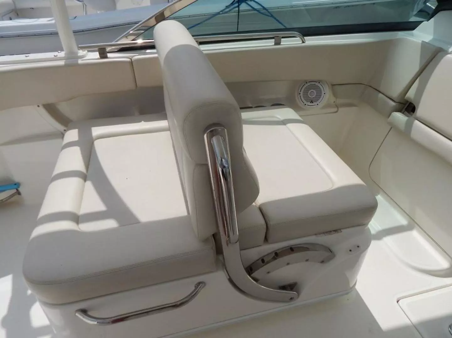 Power across the saltwater with the optional 200hp Mercury Four Stroke Verado engines and a 175-gallon fuel tank, and rest assured that the ride will be an absolute pleasure for your guests, thanks to an extensive bow seating area with lounge backrests. For those who like to entertain on a cruise, you'll be the host with the most. With the optional summer kitchen comes with several luxury touches, such as a refrigerator, electric grill and tool holders.