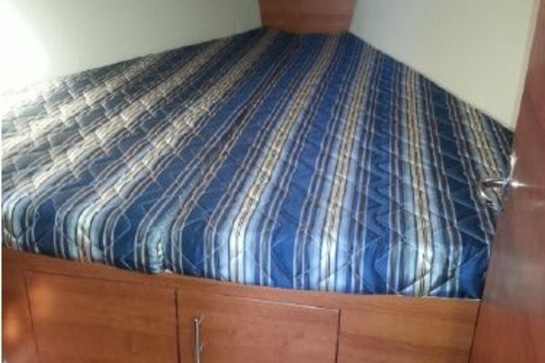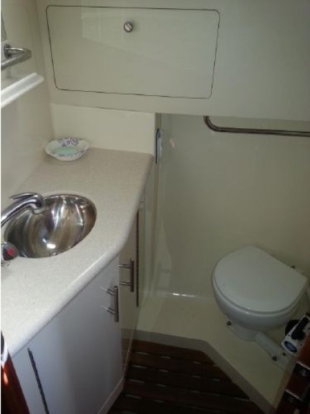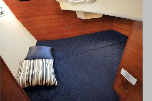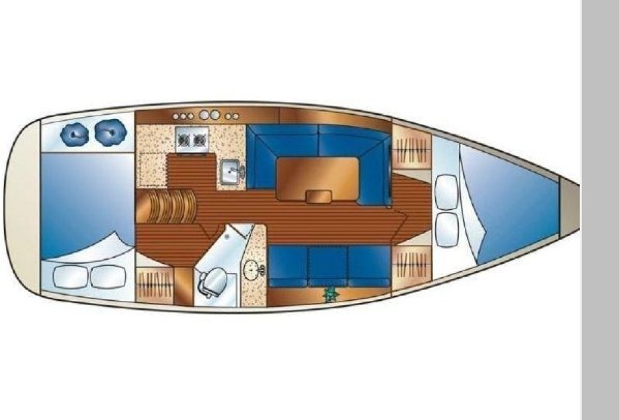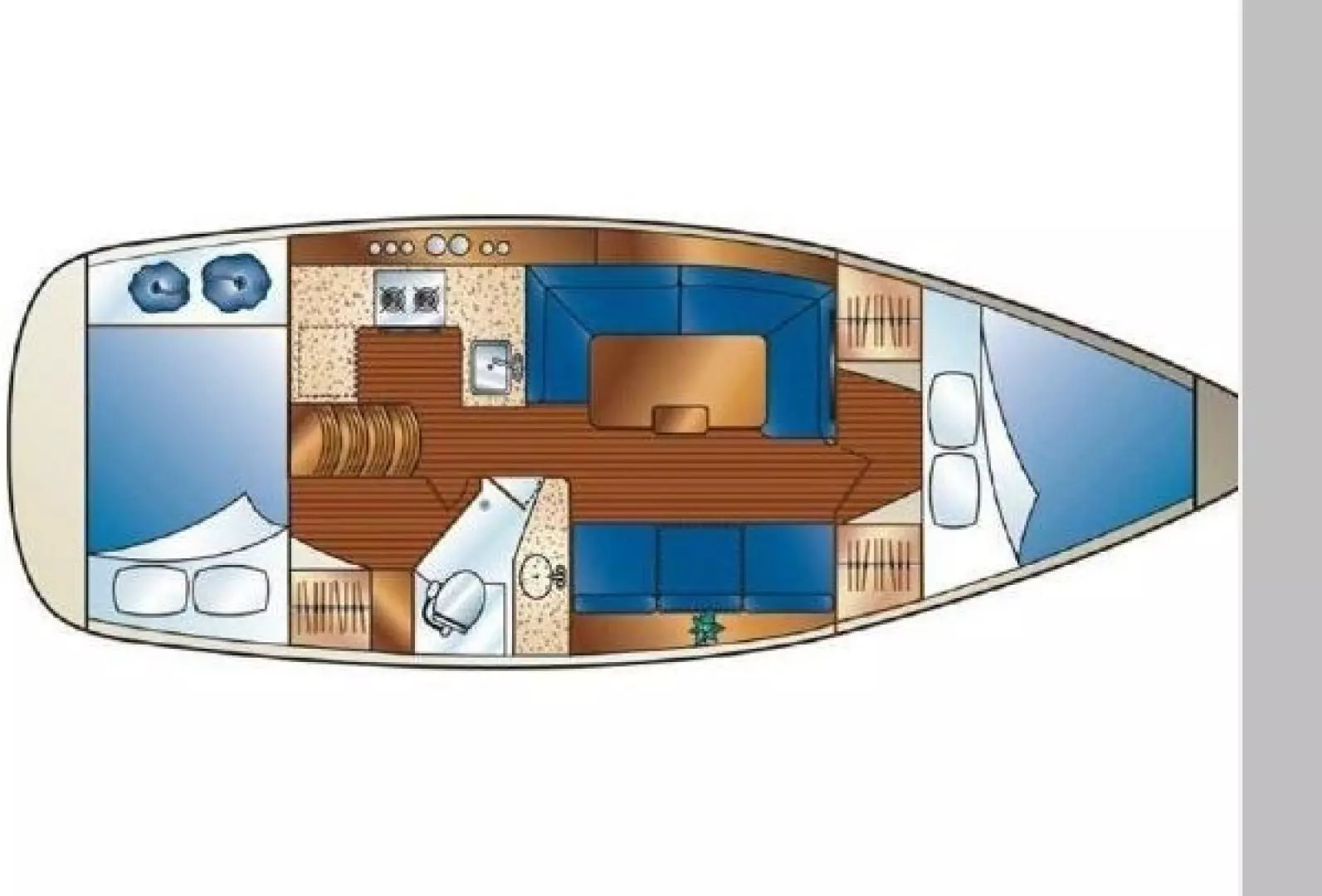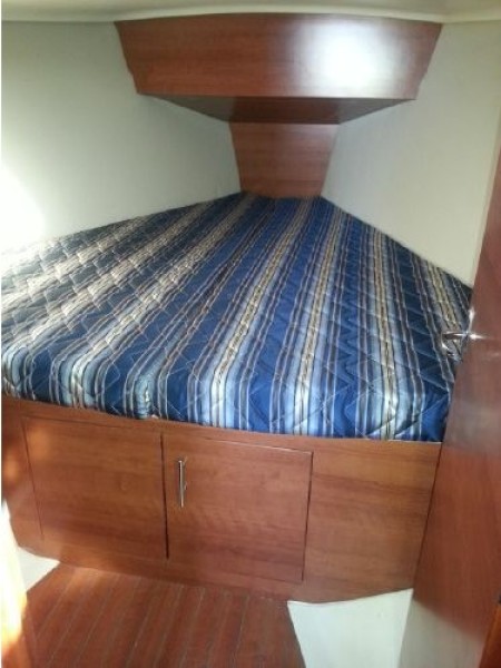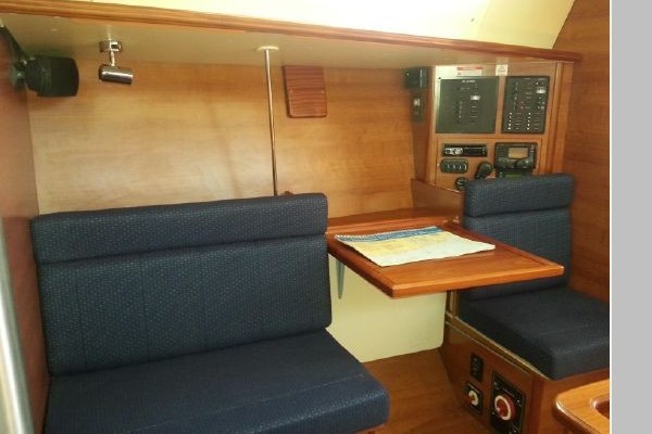 This is a 2 stateroom layout with berths for 6. Starting in the forward stateroom is the V-berth with storage underneath and 2 hanging lockers. Next aft is the main salon with a dinette to port and settee/navigation station to starboard. Next aft is the galley to port and the enclosed head. The aft stateroom is entered aft of the head and has a large double, hanging locker and storage.