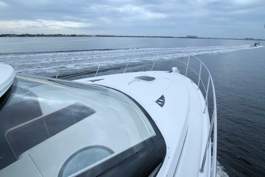 The 441 Sedan features an open, light-filled salon with 360° visibility, a raised galley and dinette, and a large flybridge with air conditioning and hardtop enclosure. Below, a two-stateroom, two-head layout includes a private forward master suite and a spacious full-beam VIP guest stateroom midship.