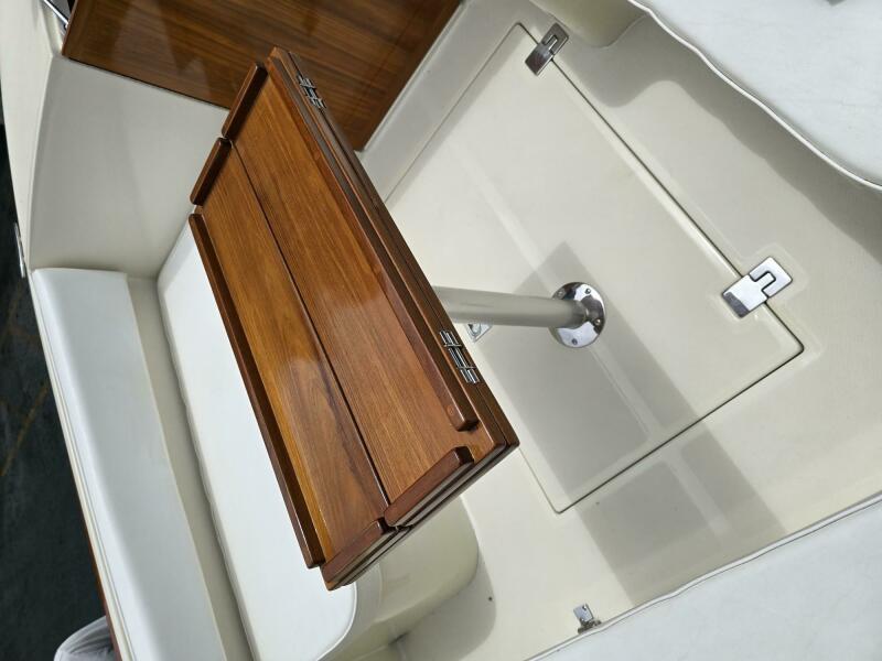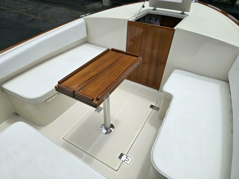 - Complete varnished teak package including head door, teak bow table with fillers and cushion, 2 position leg