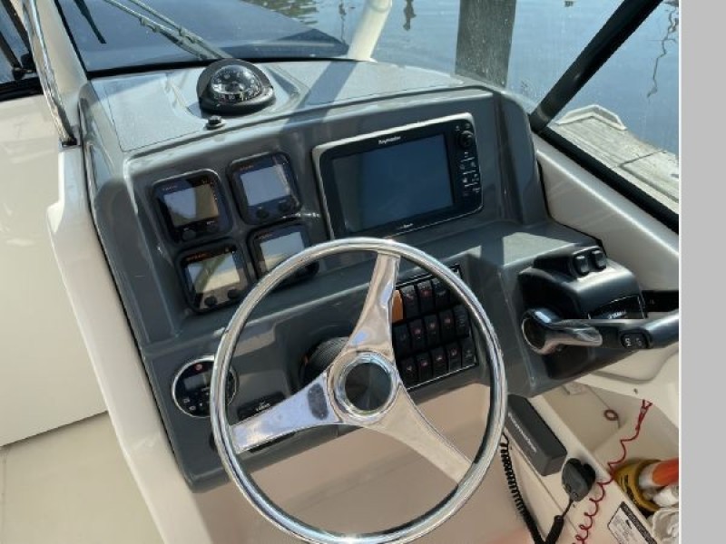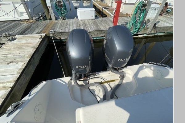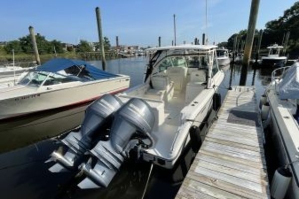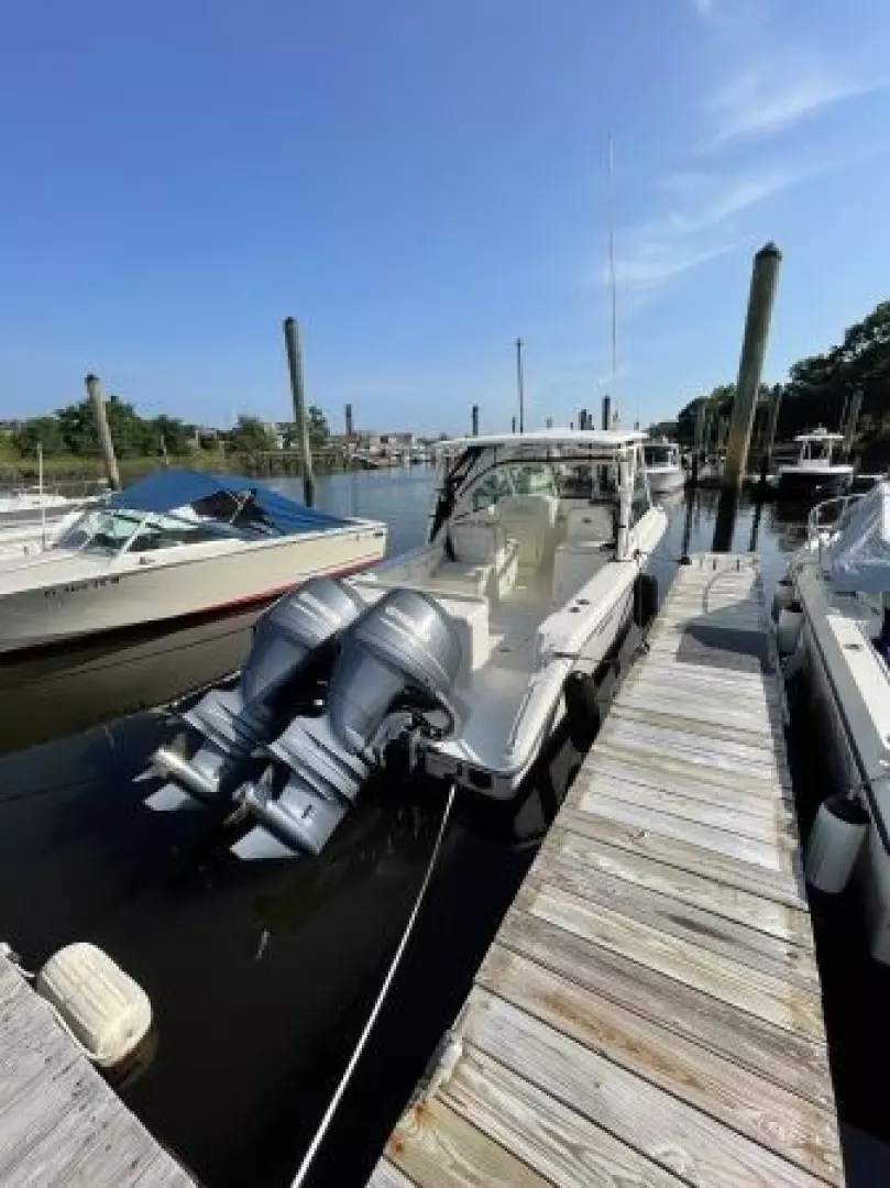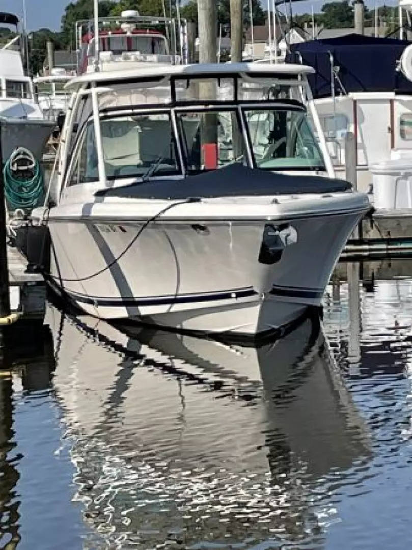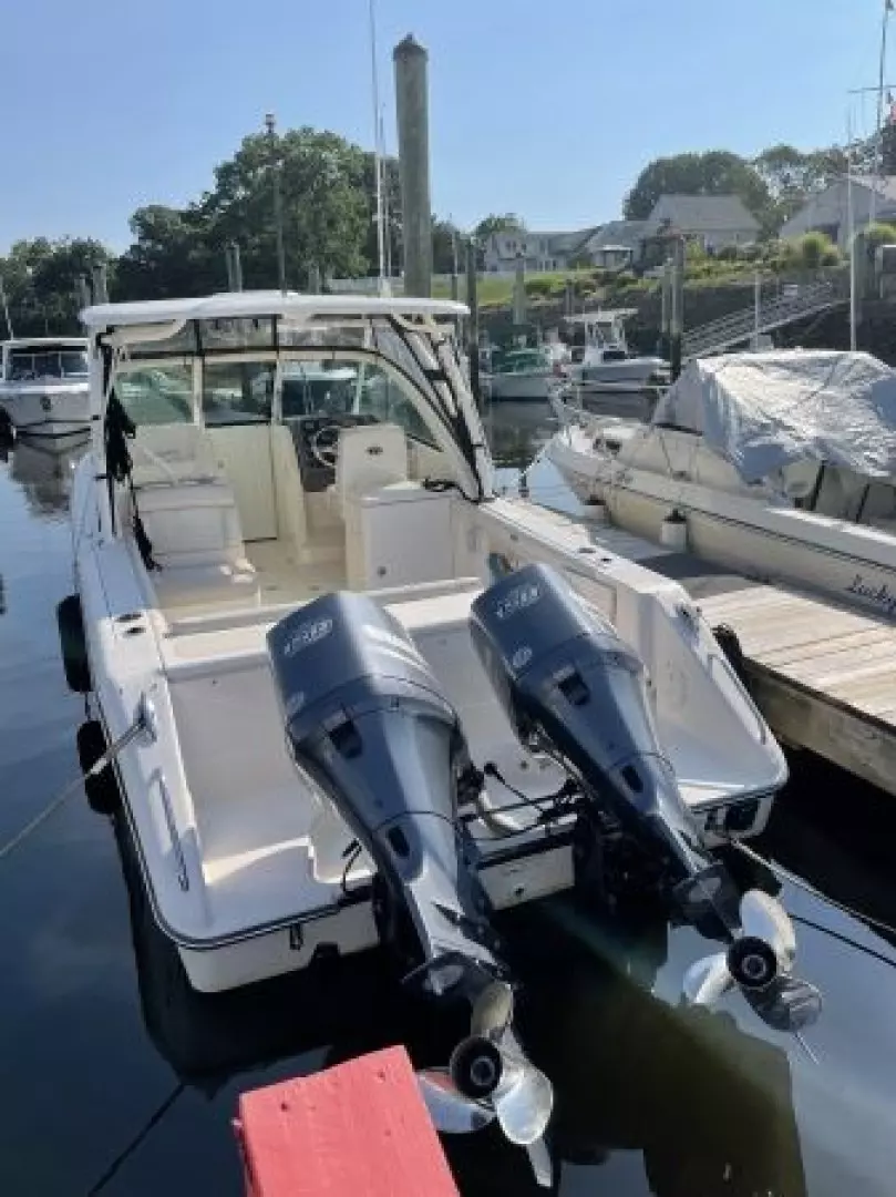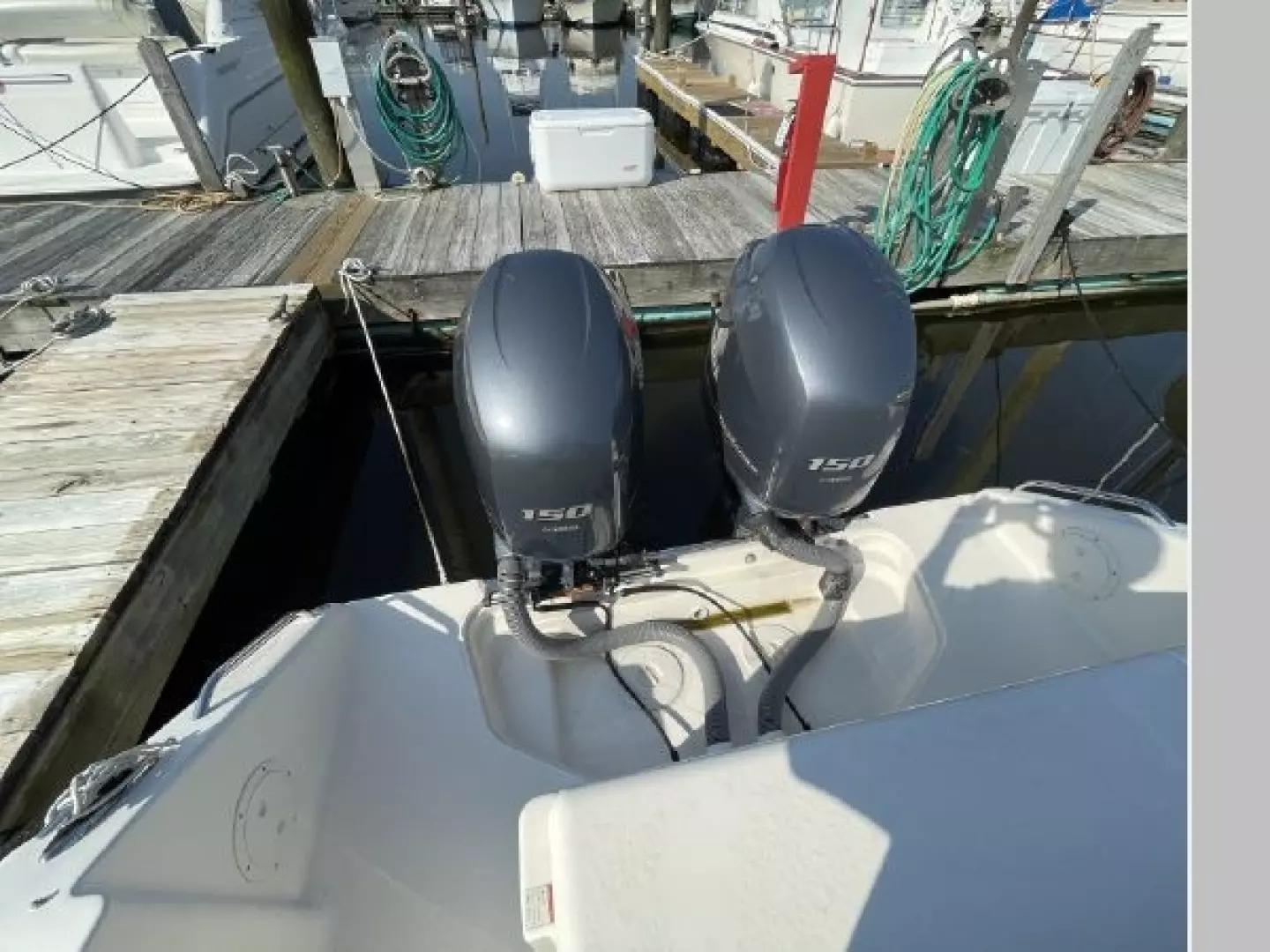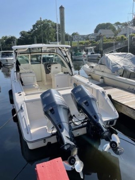 The Pursuit DC 265 Dual Console has become a legend for a combination of family fun on the water as well as a fishing machine. Built with vinylester resins this hand laid fiberglass hull is built with no wood in its construction has a 21-degree deadrise design which translates to a solid platform to handle all sea conditions. Its sharp lines and aggressive forward stance and flare keep things dry. Equipped with a pair of 150 HP Yamaha outboards, a nice complement of marine electronics and a tandem axle aluminum frame bunk boat trailer. Presently located on the Branford River, Branford, CT
