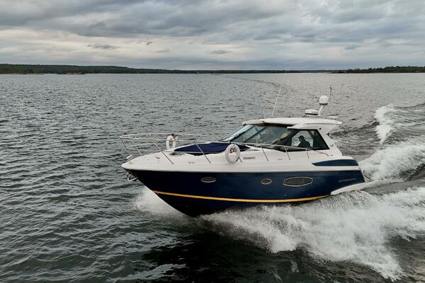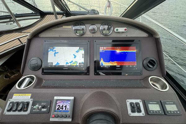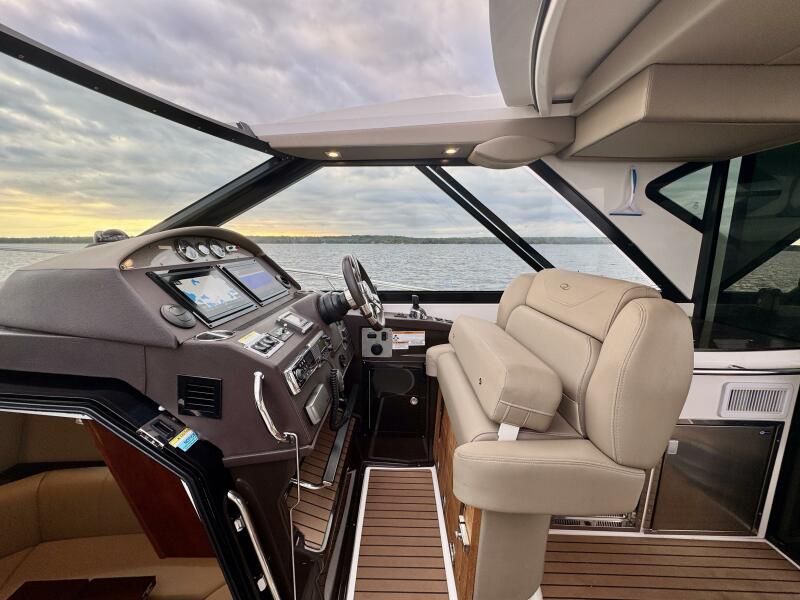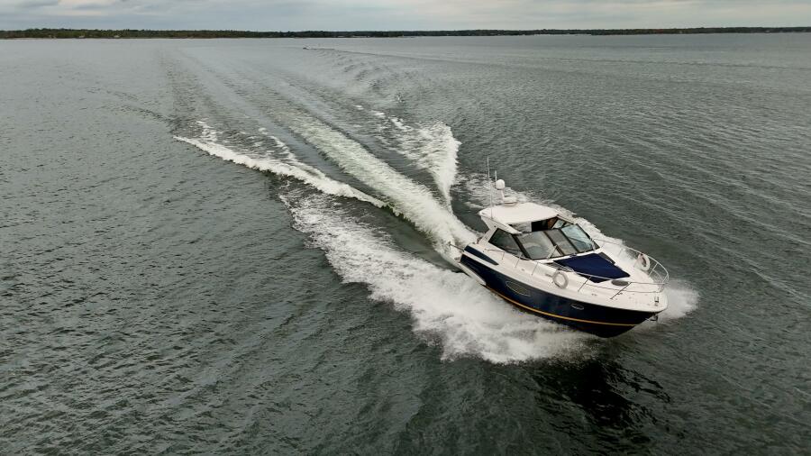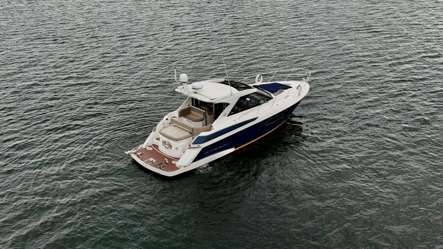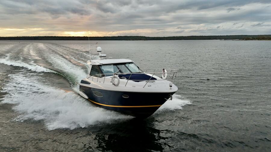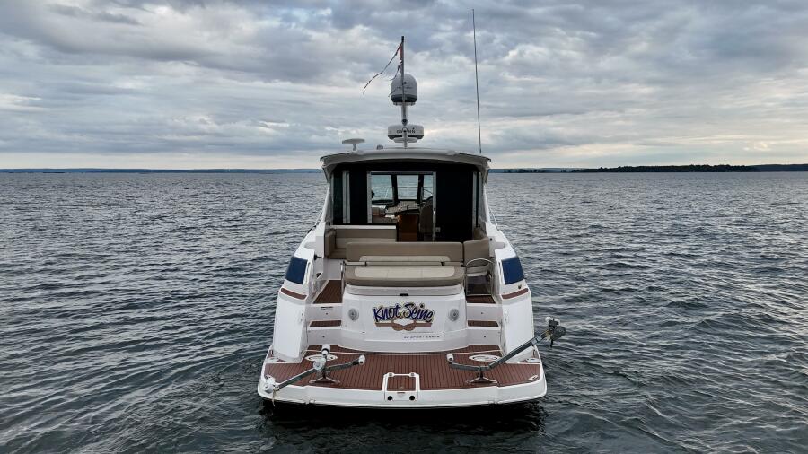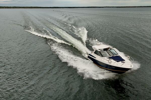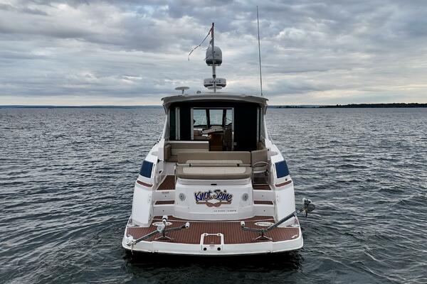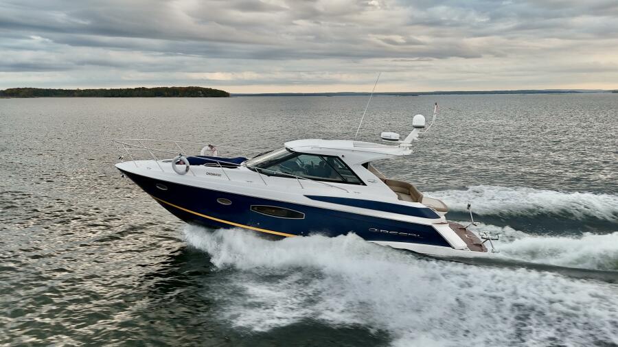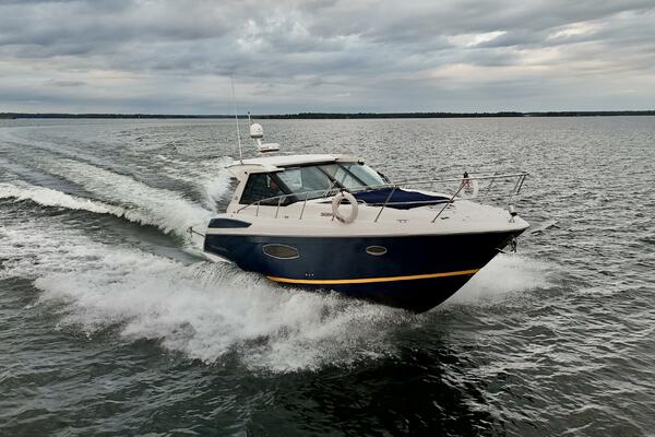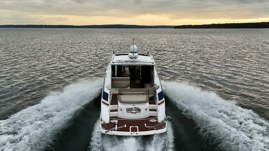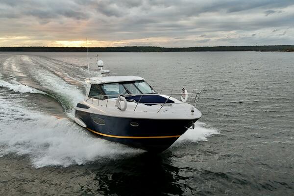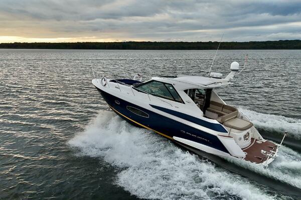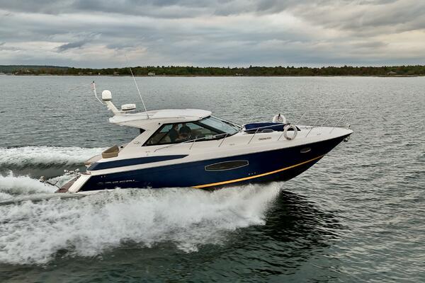 A cutting-edge design when she was introduced in 2011, the Regal 42 Sport Coupe is a sleek Eurostyle express designed for cruising in comfort and style. The full-beam convertible hardtop electrically slides back from the windshield frame to reveal an enormous opening, and sliding glass door and windows convert open aft to give the boat an open feel, with the option to be enclosed with air conditioning. Below deck, the two-stateroom two-head interior of the 42 Sport Coupe includes a private master stateroom forward with an island queen berth. The mid-cabin stateroom features twin berths, an en-suite head, and a pocket door for added privacy. A U-shaped sofa and full-service galley occupy the salon, which is notable for its full standing headroom. The cockpit can be accessed from both sides of the extended swim platform, and the center section of the deck lifts for access to the engines. Unlike some manufacturers of this era who installed pod drives in hulls originally designed for inboard power, Regal engineers designed the hull of the 42 Sport Coupe specifically for Volvo IPS pod drives.