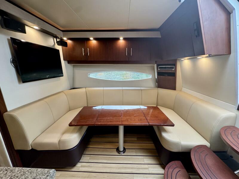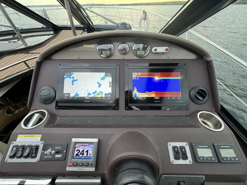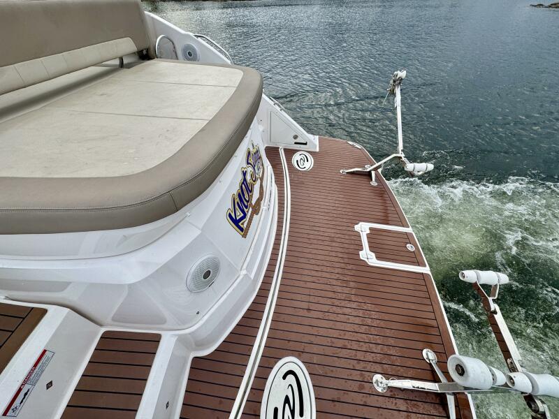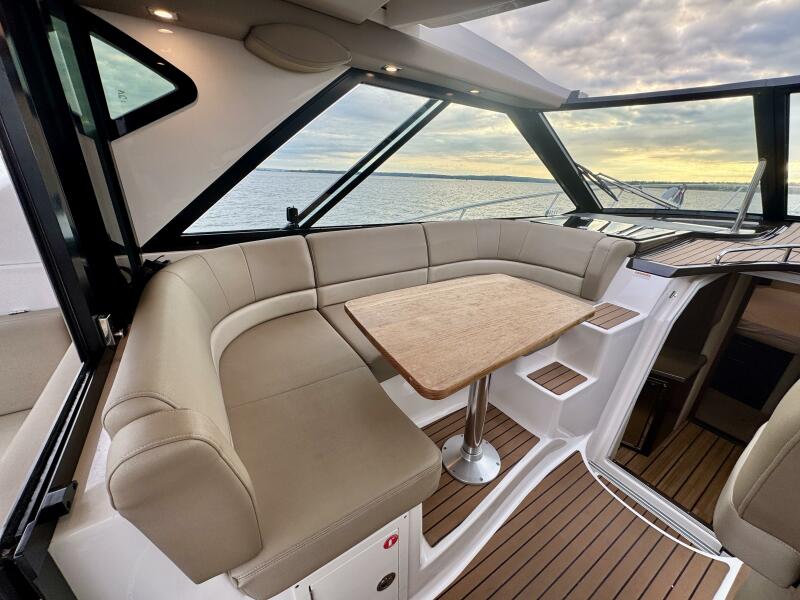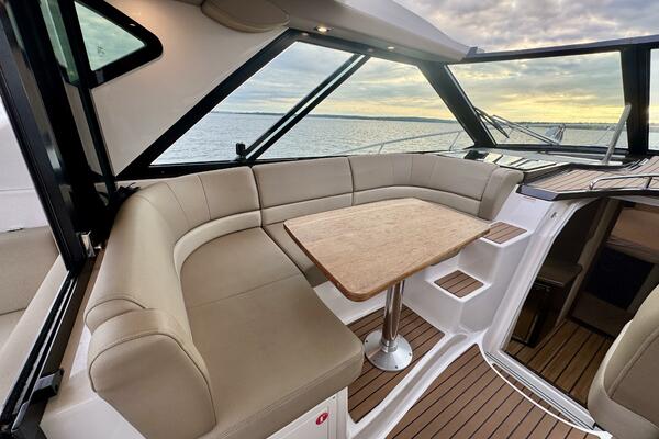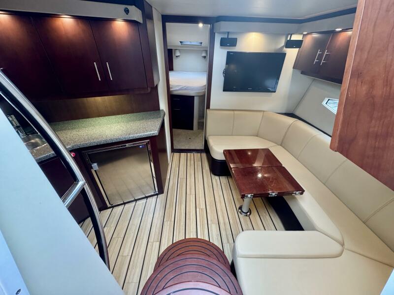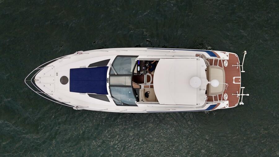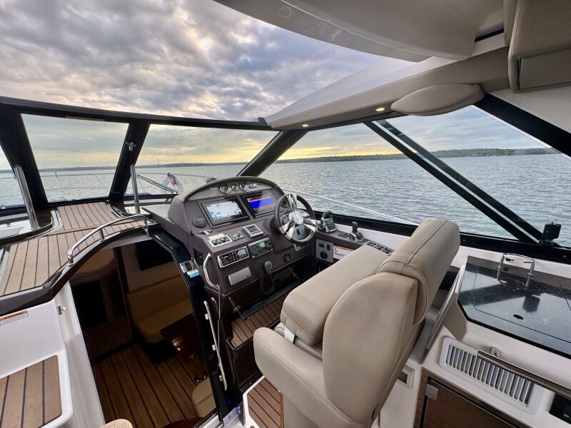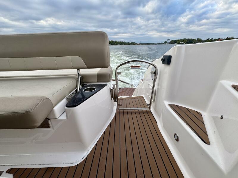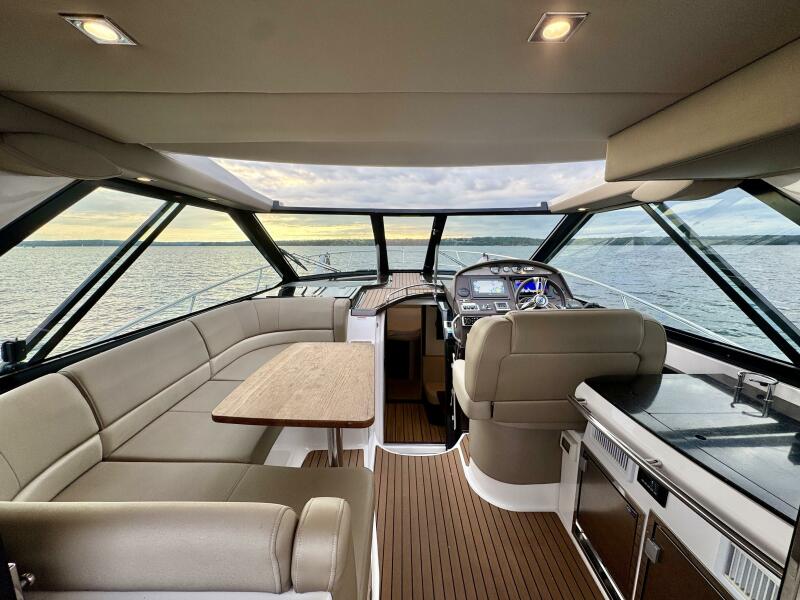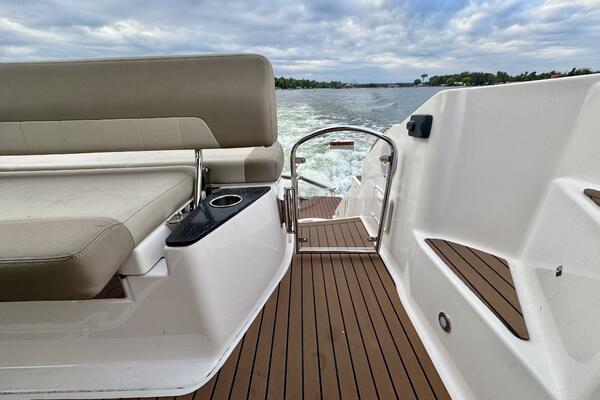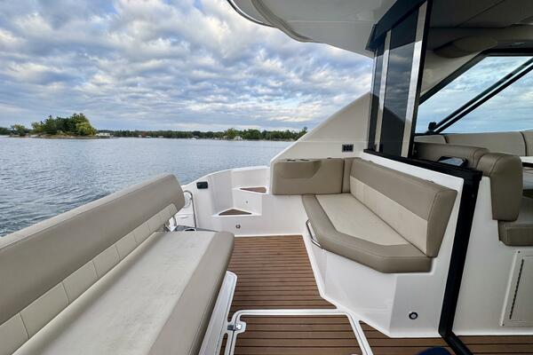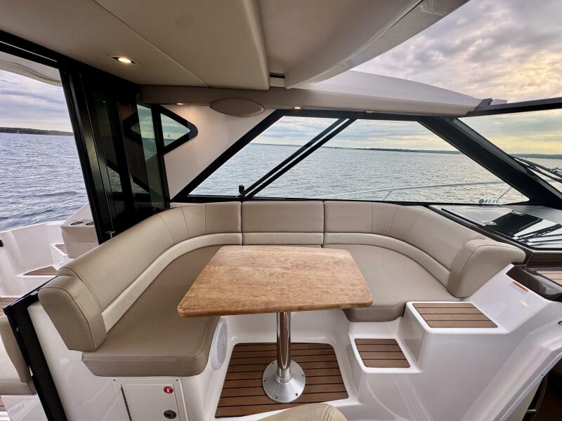 A cutting-edge design when she was introduced in 2011, the Regal 42 Sport Coupe is a sleek Eurostyle express designed for cruising in comfort and style. The full-beam convertible hardtop electrically slides back from the windshield frame to reveal an enormous opening, and sliding glass door and windows convert open aft to give the boat an open feel, with the option to be enclosed with air conditioning. Below deck, the two-stateroom two-head interior of the 42 Sport Coupe includes a private master stateroom forward with an island queen berth. The mid-cabin stateroom features twin berths, an en-suite head, and a pocket door for added privacy. A U-shaped sofa and full-service galley occupy the salon, which is notable for its full standing headroom. The cockpit can be accessed from both sides of the extended swim platform, and the center section of the deck lifts for access to the engines. Unlike some manufacturers of this era who installed pod drives in hulls originally designed for inboard power, Regal engineers designed the hull of the 42 Sport Coupe specifically for Volvo IPS pod drives.