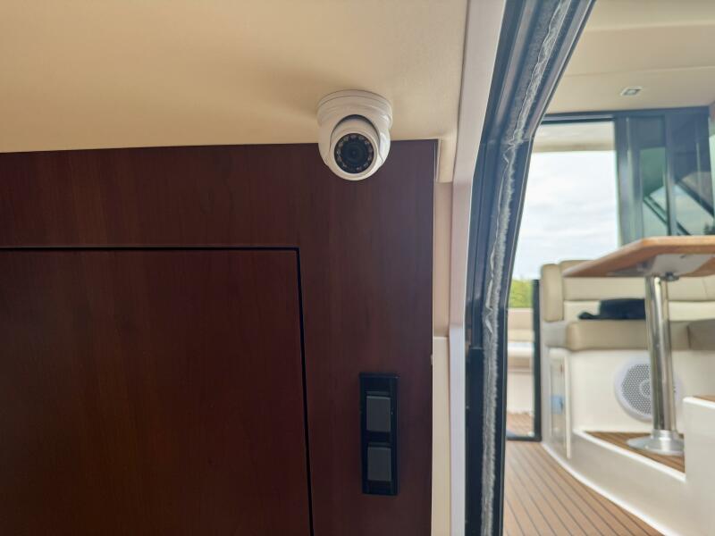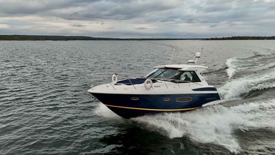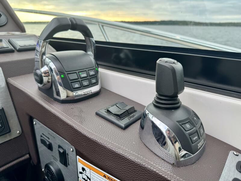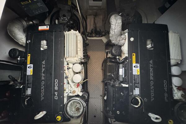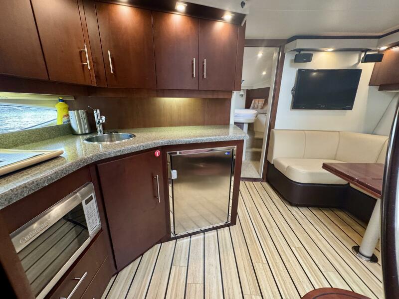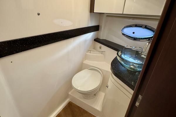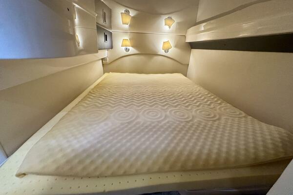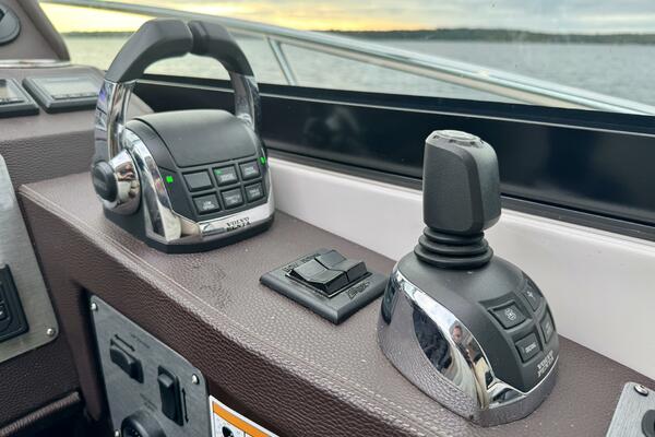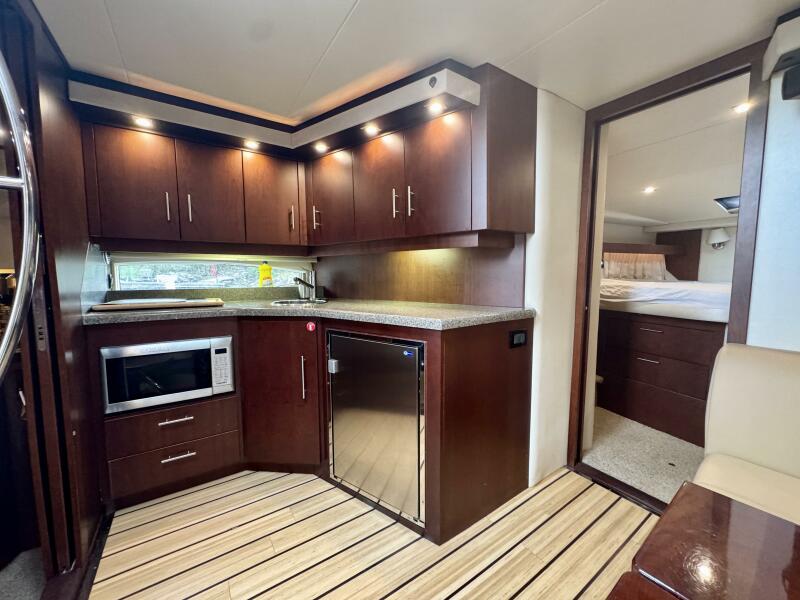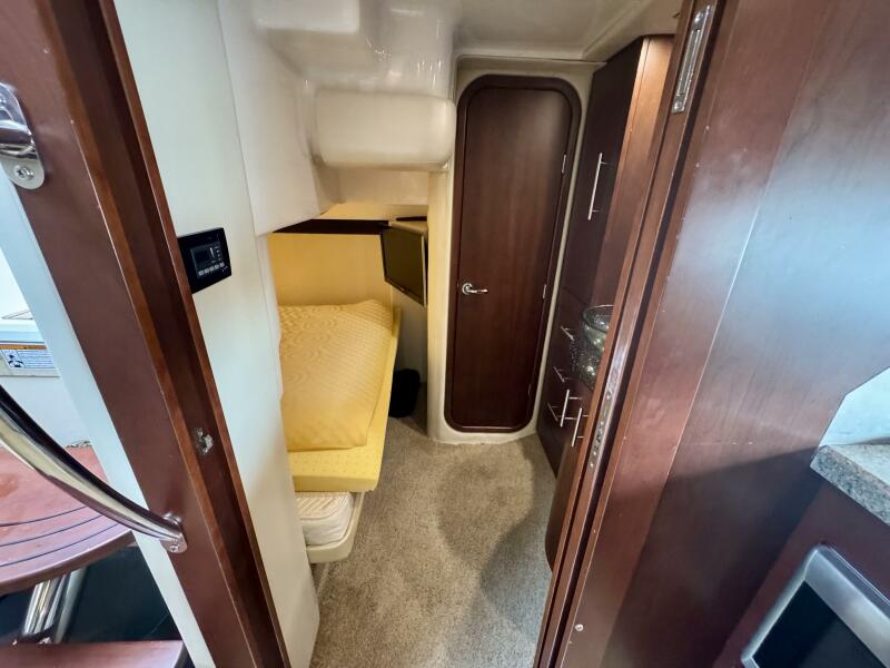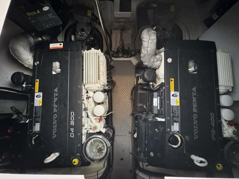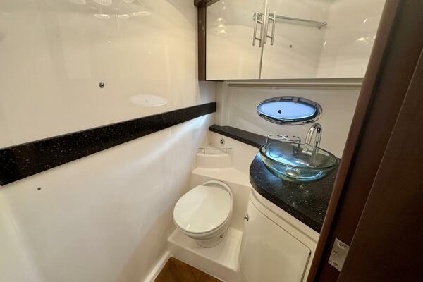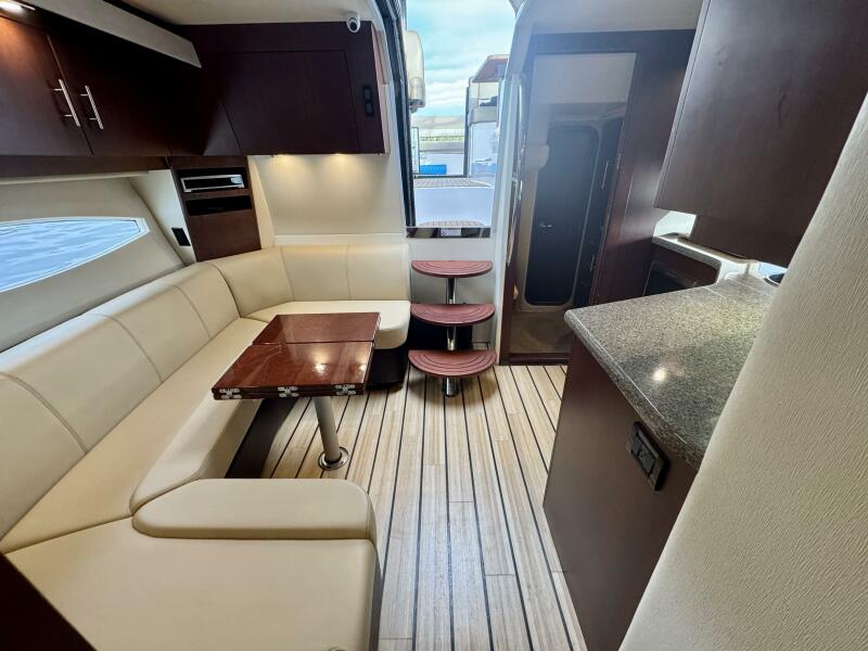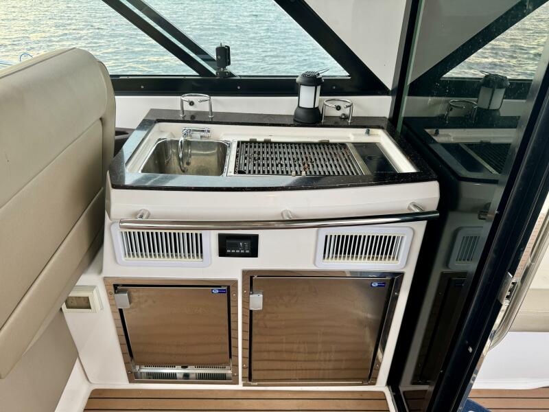 A cutting-edge design when she was introduced in 2011, the Regal 42 Sport Coupe is a sleek Eurostyle express designed for cruising in comfort and style. The full-beam convertible hardtop electrically slides back from the windshield frame to reveal an enormous opening, and sliding glass door and windows convert open aft to give the boat an open feel, with the option to be enclosed with air conditioning. Below deck, the two-stateroom two-head interior of the 42 Sport Coupe includes a private master stateroom forward with an island queen berth. The mid-cabin stateroom features twin berths, an en-suite head, and a pocket door for added privacy. A U-shaped sofa and full-service galley occupy the salon, which is notable for its full standing headroom. The cockpit can be accessed from both sides of the extended swim platform, and the center section of the deck lifts for access to the engines. Unlike some manufacturers of this era who installed pod drives in hulls originally designed for inboard power, Regal engineers designed the hull of the 42 Sport Coupe specifically for Volvo IPS pod drives.
