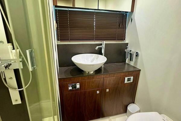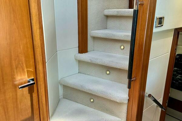 The Sunseeker Manhattan 53 is designed to maximize enjoyment of the marine environment through its well-conceived deck spaces. The aft cockpit serves as a natural extension of the main salon, blurring the lines between indoor and outdoor living. This spacious area, often finished with elegant teak decking, is ideal for relaxation and socializing, providing space for al fresco dining and comfortable seating. Seamlessly connected to the cockpit is the swim platform, a key feature for watersports enthusiasts and facilitating easy boarding; its hydraulic operation (if equipped) enhances its functionality. Moving forward, the foredeck offers another area for relaxation, frequently utilized for sunbathing with available sun pads. The flybridge is a standout feature, acting as a central hub for socializing, entertaining, and navigation. This elevated space includes a second helm station for optimal visibility, ample seating (often in a wrap-around configuration), and amenities such as a wet bar, refrigerator, and sometimes an electric barbecue. Shade is often provided by a Bimini top. In some configurations, a crane is included for launching and retrieving a tender. These deck areas collectively provide a variety of spaces for dining, lounging, watersports, and simply enjoying the views.