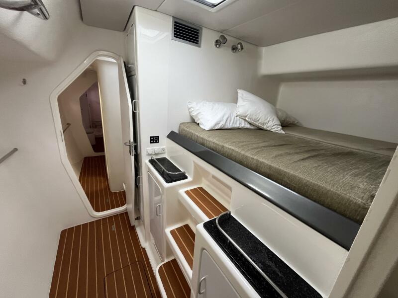 - Bar counter (fore & aft) with seating for 3, midships