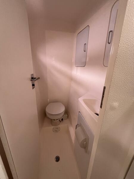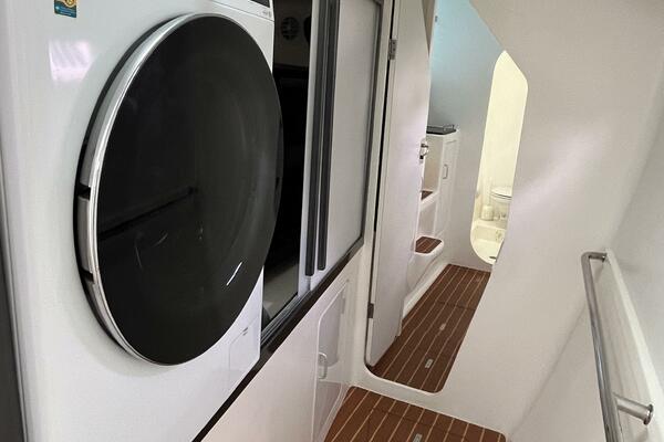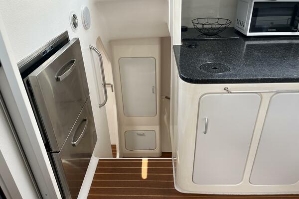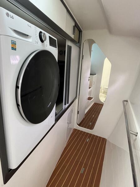 - Top loading freezer in cabinet ahead of doorway between Salon and Galley