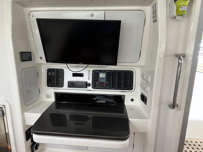 - BBQ on custom arm w/ quick snap propane attachment, port coaming