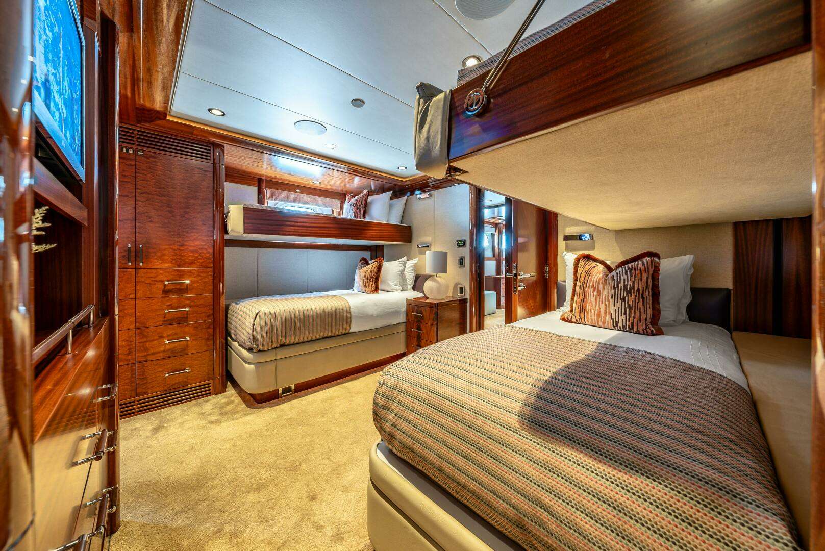 Accommodation for up to 15 guests in 6 staterooms: 1 Master on the Bridge Deck, 1 VIP on the Main Deck, 2 Doubles and 2 Twins (plus 3 Pullman berths) on the Lower Deck. Additional accommodations for up to 12 crew in 6 cabins: 5 double cabins forward/below and 1 captain’s cabin on the Main Deck.