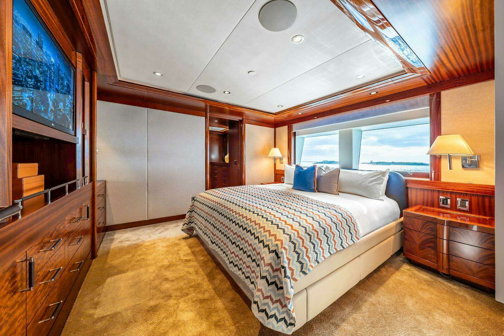 Master stateroom and en-suite, with steam shower, a private exterior deck, and extended master head and closet space used from relocation of captain’s cabin.
