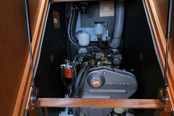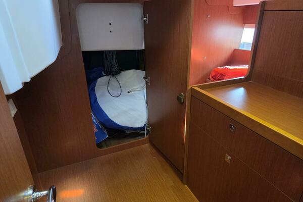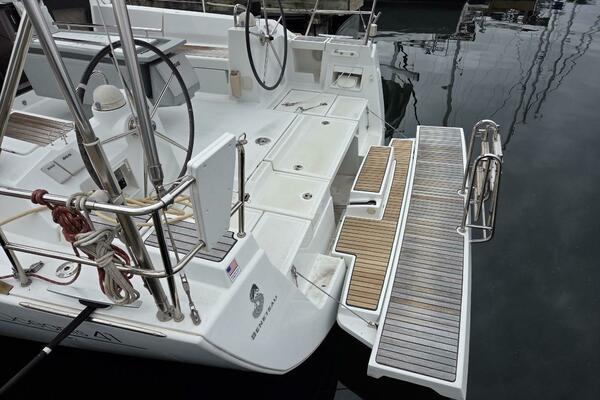 This Oceanis 41 features a large cockpit with dual wheels and teak seating plus custom cushions for port & starboard benches. The fully-opening electric transom drops down into a wide, spacious swim platform with integrated swim ladder. Central in the cockpit is a large table with fold-down leaves and built-in ice chest storage for beverages. Cockpit storage consists of a shallow starboard lazarette and a deep, spacious port side garage/workshop. She is well-equipped with plenty of fenders and a wide array of docking/lock lines.