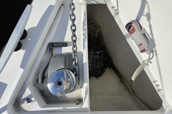 The entire cockpit is covered by a black with grey trim Iverson dodger and bimini with a connector panel which can be easily removed in good weather. At the bow is a spacious anchor locker with an electric windlass with wired remote.