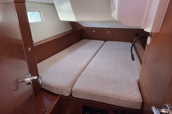Owner sleeping accommodations consist of a spacious cabin forward with a large vee berth, closet/shelf storage, and a small desk with storage. The guest berth aft has a queen-size bed, plenty of storage, and in-cabin access to the head.