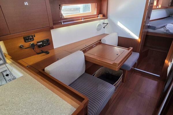 Entering thru the gradual-sloping companionway steps, you are greeted by a bright, open salon. The large starboard-side dinette table features U-shaped seating with newer, bright upholstery. To port is unique configurable seating with nav station - all three components slide allowing the nav table between or on either side of the two seats.