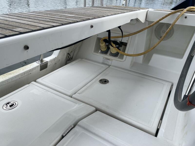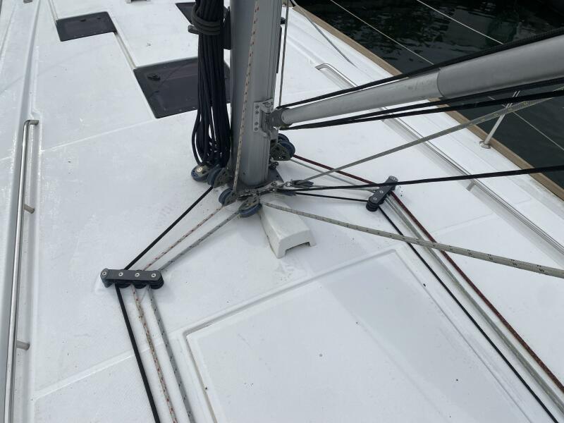 In the cockpit Cloud Nine features duel helm stations for comfortable navigation and good visibility. The dodger connected with bimini keeps everyone protected from the weather. The boom is 7’6” off the deck with main sheet blocks mounted on the arch keeping the cockpit free from danger. A wide beam gives passengers safety with plenty of room to relax. Transom can fully open and close with the push of a button, great for moving gear on and off the boat, accessing your dinghy, or getting back on the boat after a dip.
