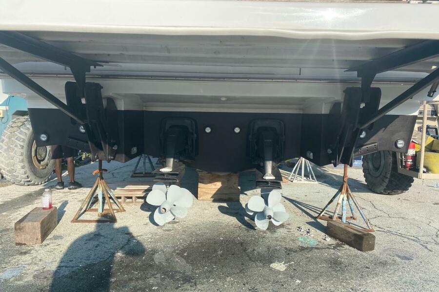 Rear view of 2014 Beneteau Gran Turismo 44 boat on stands, showing dual propellers.
