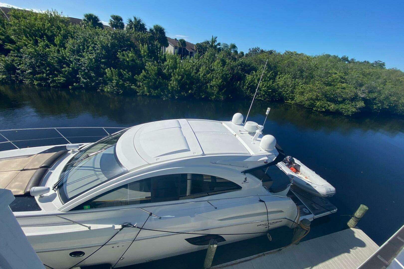 Inflatable boat with outboard motor docked beside a Beneteau Gran Turismo 44, 2014 model.
