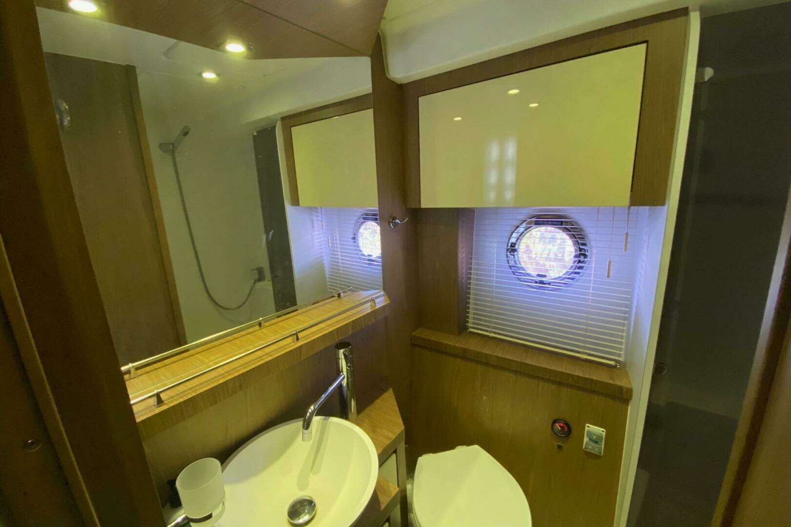 Bathroom interior of 2014 Beneteau Gran Turismo 44 yacht, featuring modern fixtures and porthole window.