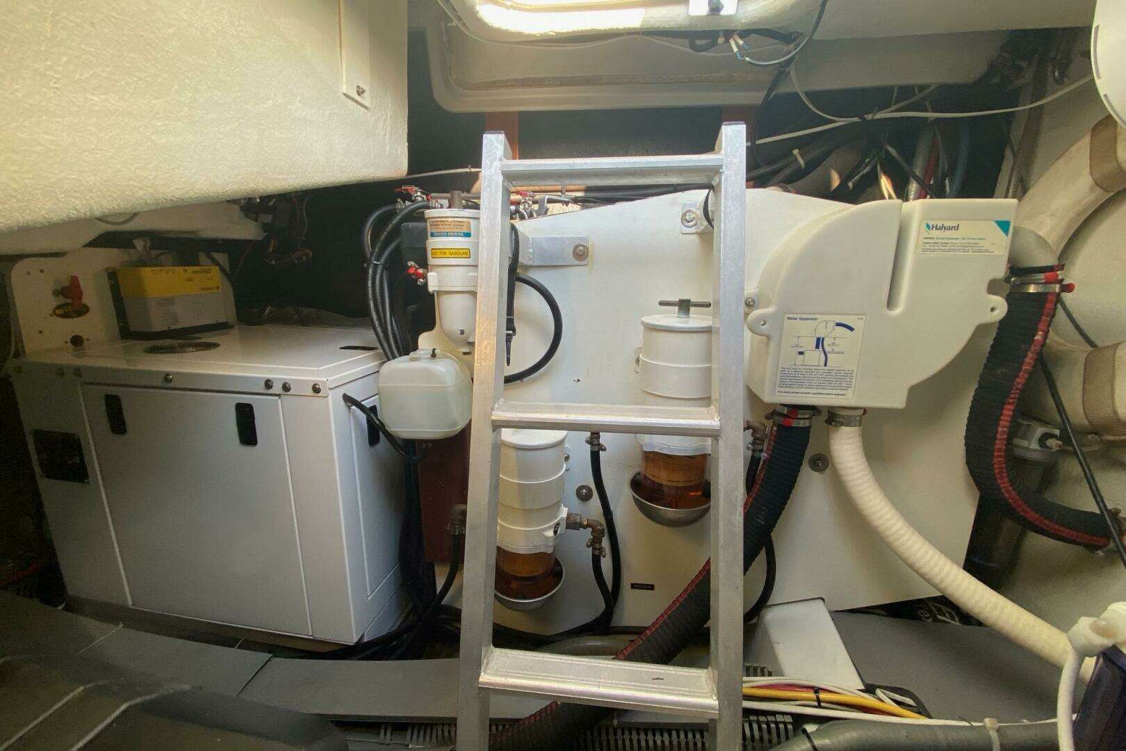 Engine room of a 2014 Beneteau Gran Turismo 44 with visible machinery and ladder.