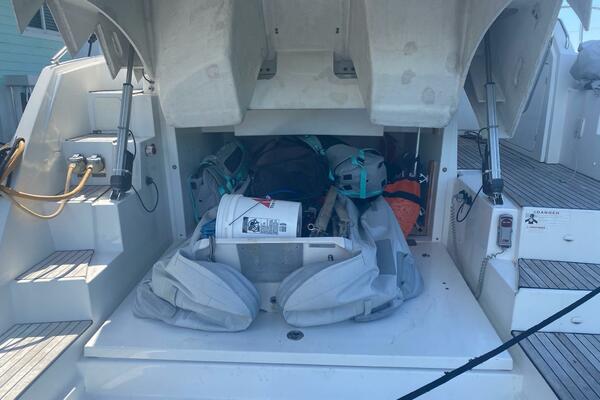 Storage compartment of 2014 Beneteau Gran Turismo 44 with anchor and orange mesh bag.