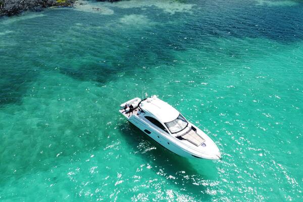 Aerial view of 2014 Beneteau Gran Turismo 44 yacht on turquoise water.