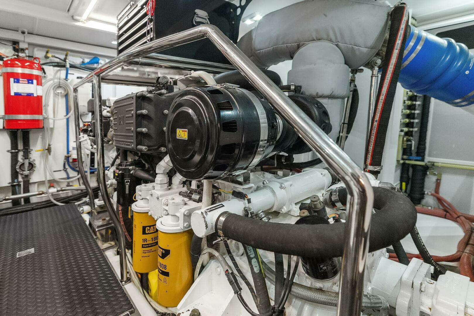 Entrance to the spacious Engine Room is through the dual handle latching door. Located within are the twin CATERPILLAR C18, 918 HP marine diesel engines each with underwater exhaust, ZF transmissions, Aquatech 3” HS22 stainless steel shafts, (2) Onan Generators, WESMAR hydraulic system, WESMAR HYDRAULIC stabilizer actuator units, Reverso oil change system, automatic, emergency and manual bilge pumps, high water alarm, air conditioning unit with controls for the engine room, FRP diesel fuel tanks with back lit sight tubes, dual Racor fuel system filtration for engines and single Racor for generators, fuel hoses, crossover valves with returns, vent filters, engine and generator start batteries, emergency engine shutdown and fire suppression system, (4) 24VDC engine room ventilation fans, 24VDC lighting overhead, bronze seacocks and sea strainers on engine and generator raw water intakes, fresh water outlet, the flooring is rubberized EcoFloor with diamond pattern, sound down insulation, painted, finished bilges and stainless steel grab rails. Tool boxes are mounted above each engine.