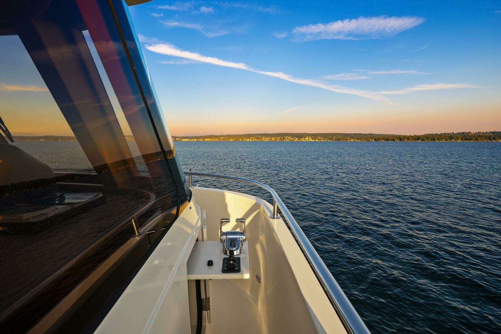 Port and starboard Control Stations with engine and thruster controls are concealed behind flush mounted weather resistant hatches along each side of the walk around Portuguese Bridge affording great line of sight maneuvering underway.