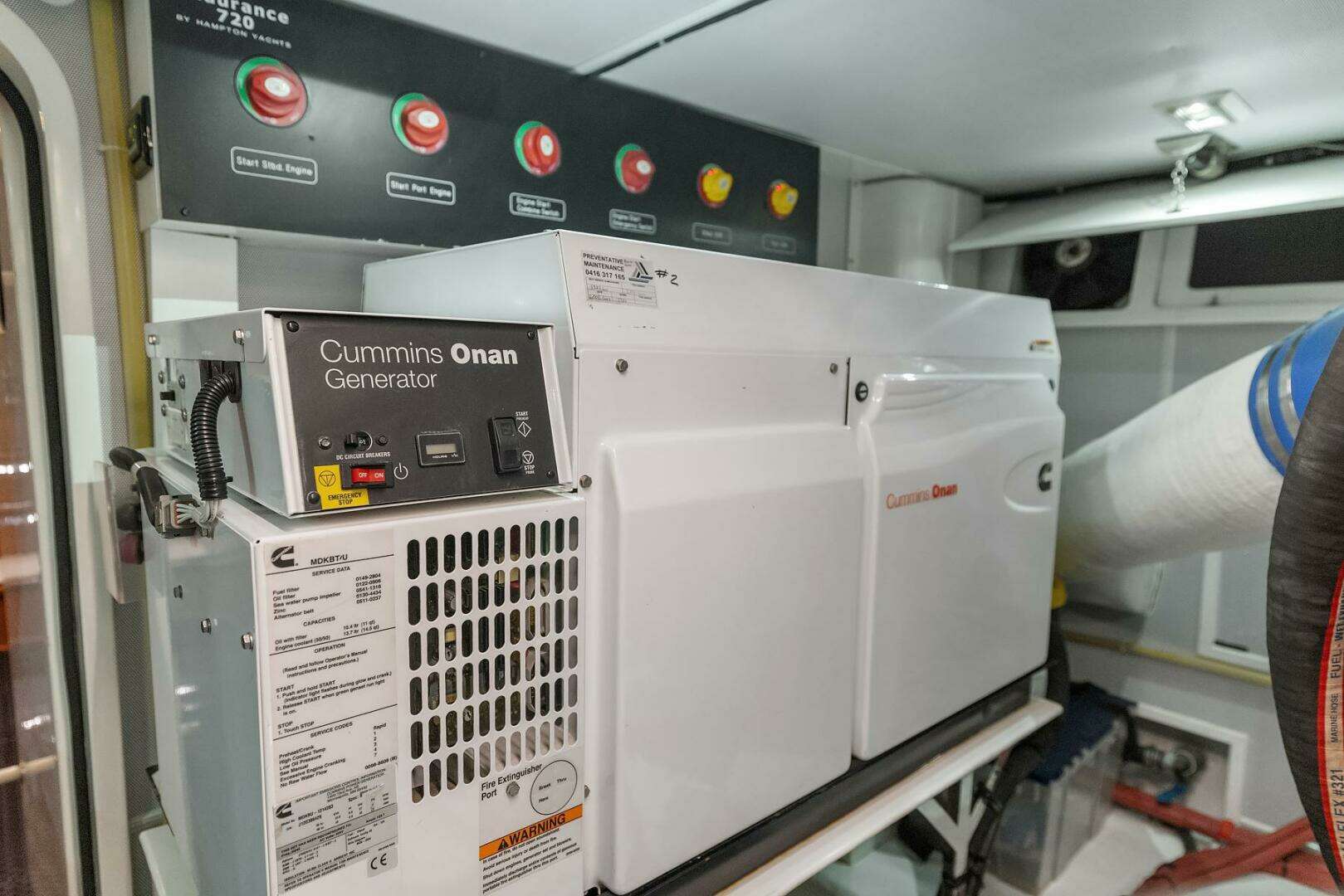 Fully integrated Electrical System with (2) ONAN 32 kW, 120/240V/60 Hz Marine Diesel Generators, Victron Energy 5 kW inverter/charger & remote panel for ship’s service, battery chargers, Lighting, transformer, House Batteries, and Aft Port Glendinning Cablemaster motorized storage system with retraction and extension of the 50A/125/250V shore power cord. The 120V / 240V AC, Inverter breaker panel, and the 24V/12V DC breaker panels are well labeled and back lit.