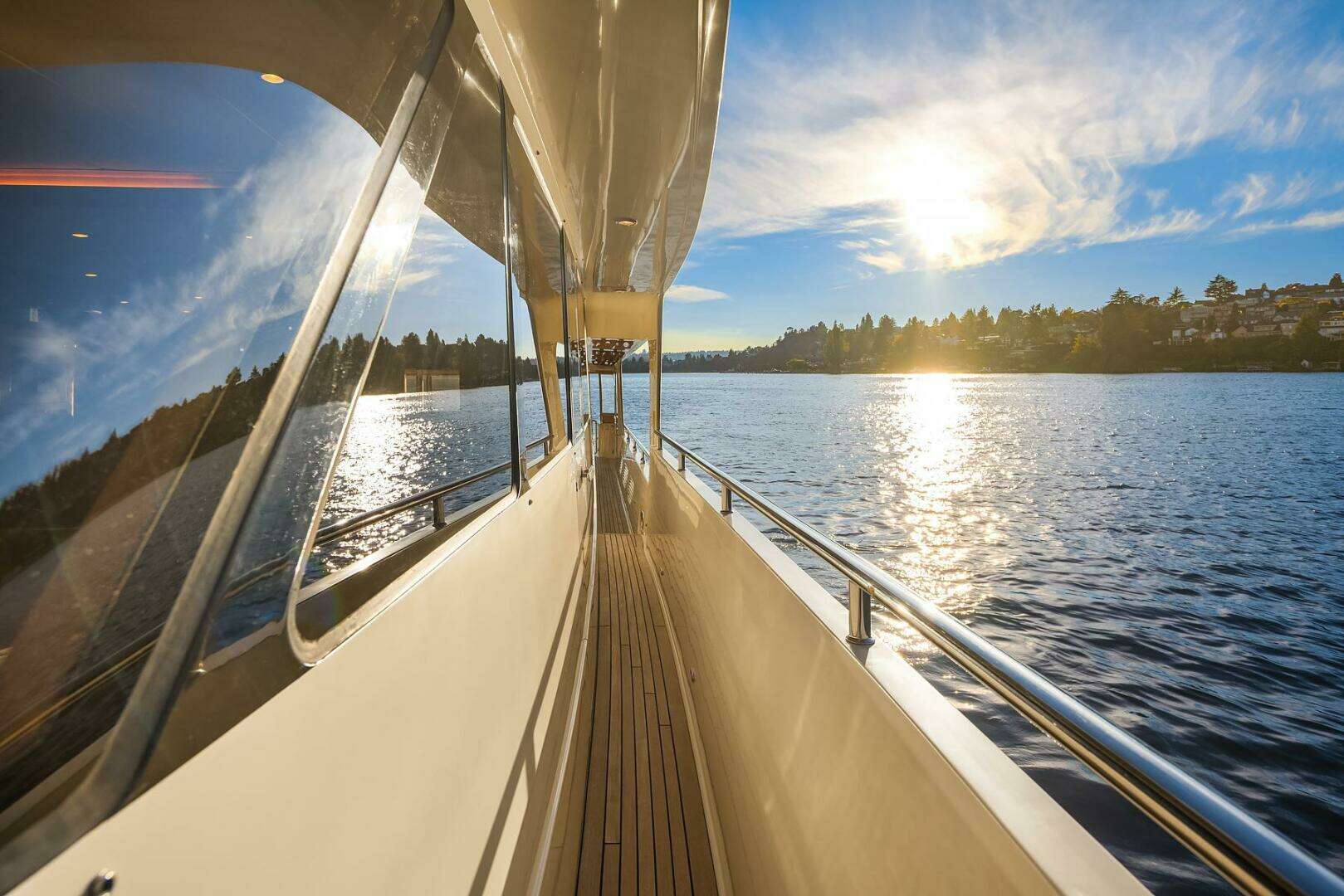 Next, you Intuitively lay hold of a well-placed handrail and ascend the courtesy lit Gently Curved steps finished with teak treads where you enter through stainless-steel framed and back-lit glass boarding gates the fully enclosed with 80 mil clear and bonded to zippered canvas panel aft deck. The decking on the aft deck and side decks are finished in teak all the way ahead to the Portuguese bridge opening to the foredeck, then the teak finished decking continues forward midline to the windlass.