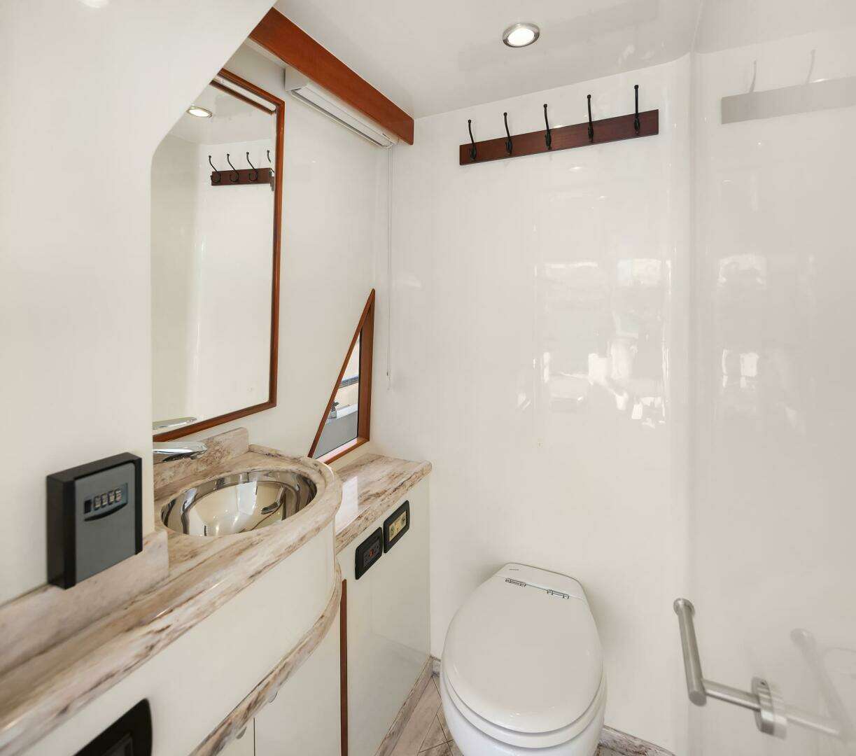 For convenience and functionality, LA BELLA VITA II has an aft deck day head which includes a Techma toilet, Marble countertops, stainless-steel sink and Grohe faucet, mirror, window with shade, overhead lighting, dual receptacle power outlet, exhaust fan, Marble floor with drain, and locking privacy door.