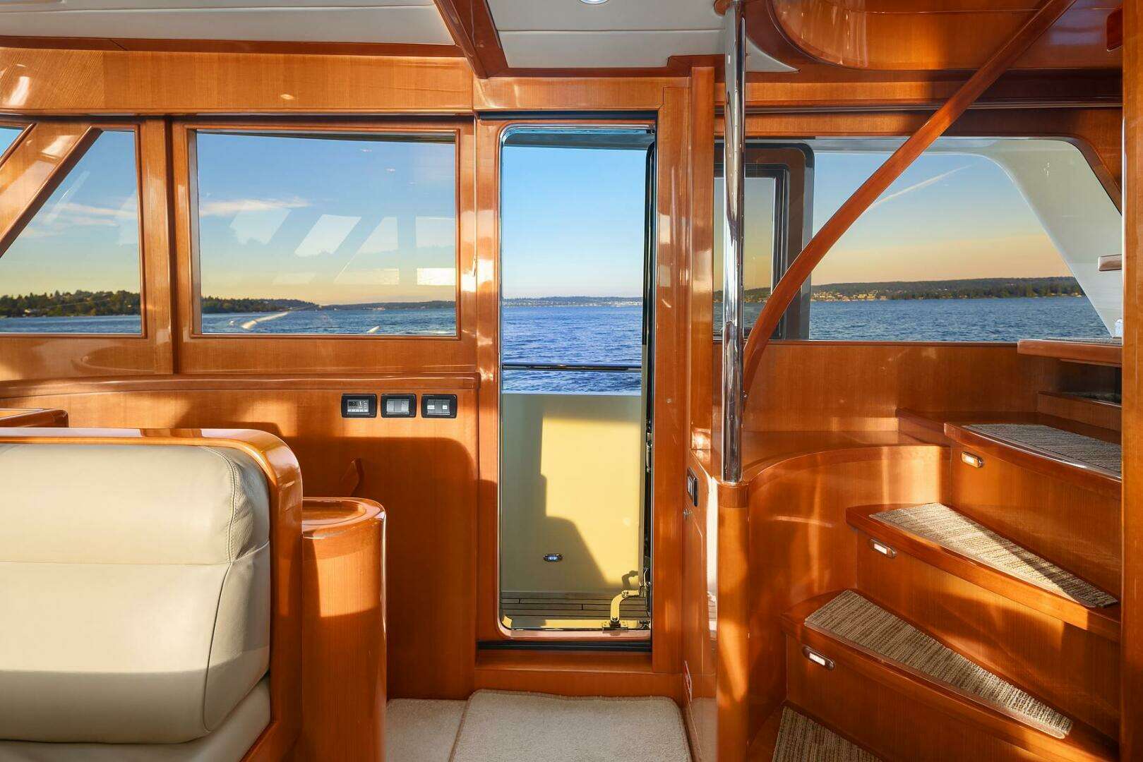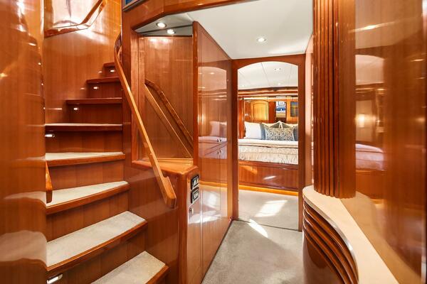 Interior Access to and from the main deck is by way of the starboard side open stairway with custom cherry treads and custom cherry handrail. The stairway has a closing swing hatch panel and sliding top hatch to separate the decks for night navigation or to accommodate multiple functions within the yacht simultaneously.