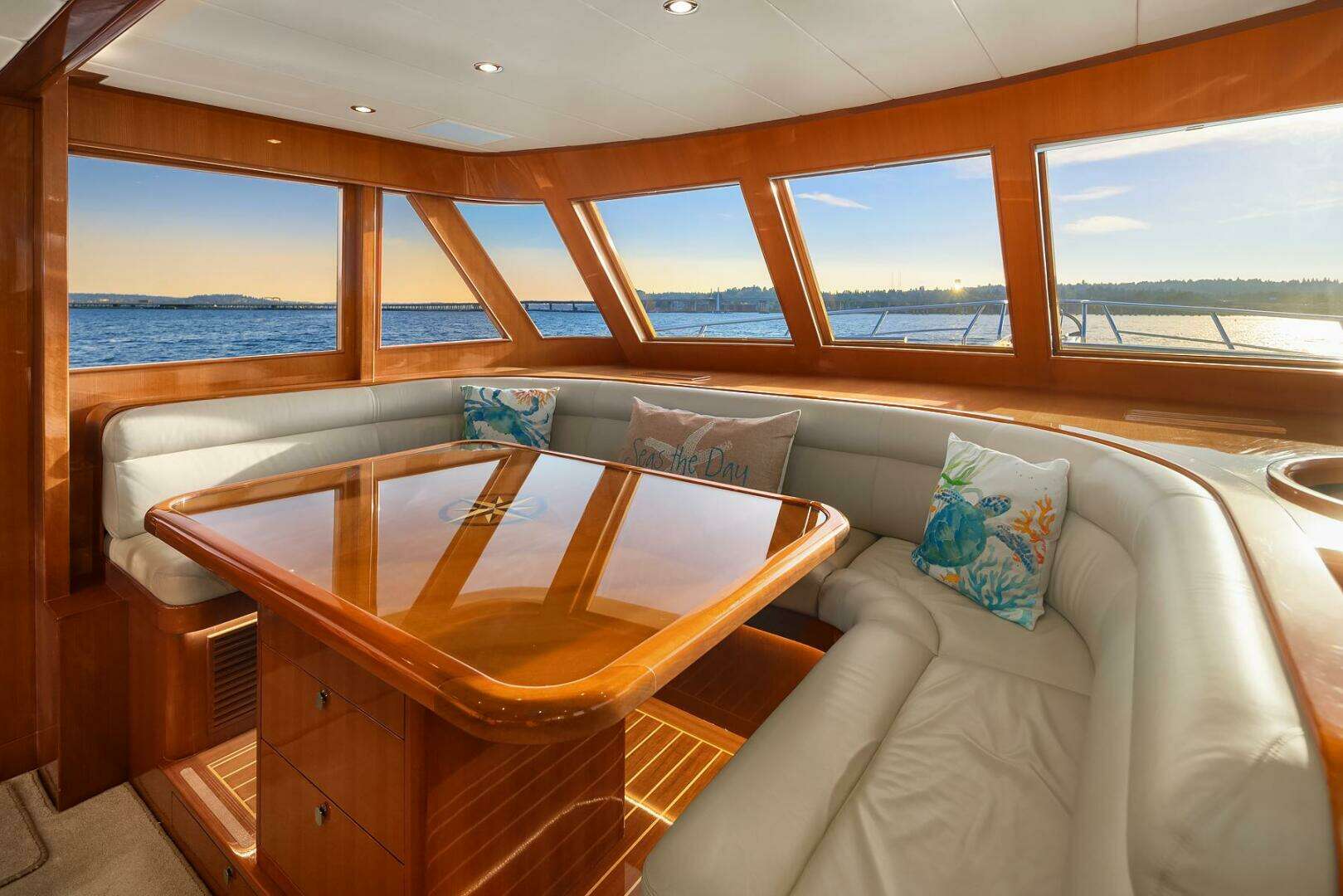 For Dining, Entertaining and Relaxing the hub of the sky lounge to port is laid out with a large custom Makore cherry gloss finished tabletop with compass rose inlay mounted atop a cherry table base which includes (2) storage drawers. The table is surrounded on three sides by a built-in cherry U-lounge which will seat 8 for your dining and entertainment gatherings and has custom upholstered cushions, pillows and storage below which includes two storage drawers. The sole is cherry with a gloss finish and providing protection and warmth over the wood floor is the custom bound edge carpet.