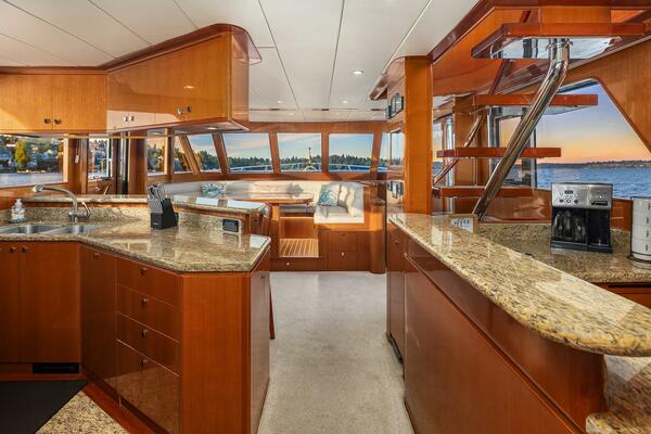 The main deck is Open from the aft deck through the salon and forward to the galley, bar and dining areas with generous headroom. Design Elements combine tasteful and durable custom carpets, fabrics, furnishings and decor throughout. Complementing the luxurious interior is stunning gloss finished Makore Cherry cabinetry, doors and wall panels, Granite counters and floors in the galley and bar areas, Marble counters and floors in all heads along with matching hardware for light fixtures, doors, cabinets and drawers.
