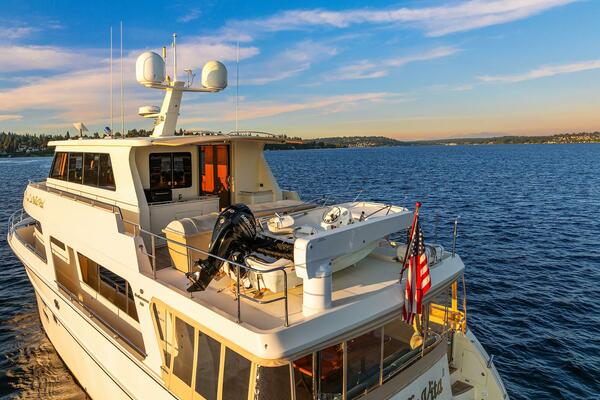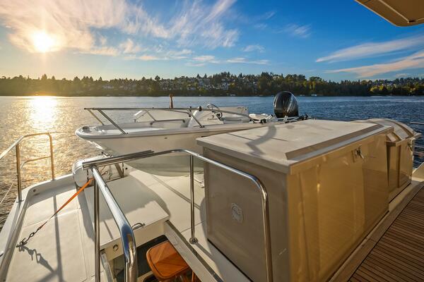 The Boat Deck section is a self-draining non-skid FRP deck area that presents a fabulous multi-use area with plentiful space and room for the Boston Whaler tender with Mercury 40 hp engine which offer launch options either to port or aft with the full extension power rotation Brower 1600-pound capacity davit.