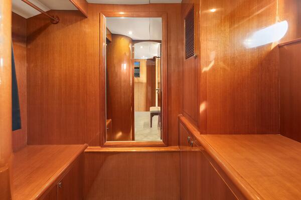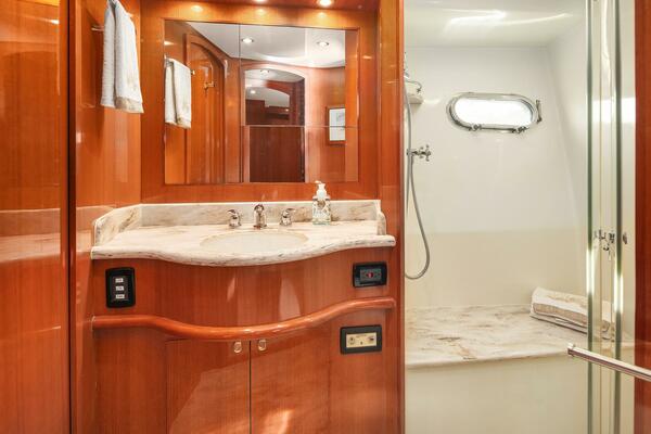 The full beam Master Stateroom is a statement of luxury possessing a king-sized walk around bed with custom mattress, bedding and pillows, storage drawers and large separate storage compartments below, custom mirrored headboard, drawer storage with makeup vanity and pullout bench, above counter glass front display cases to port, storage shelving, and drawers, above counter glass front display cases to starboard, gloss finish handcrafted custom panel Makore cherry cabinetry with latching chrome cabinet, drawer and door hardware, custom headliner and wall fabrics, lighting fixtures, dimmable fixtures, soft indirect lighting above the headboard, wall sconces at each side above the nightstands, carpeted, padded flooring,(3) hanging clothes lockers, walk-in closet with dressing area and opening portlight, well-appointed private ensuite head, vanity and shower, opening portlight, storage, 110VAC outlets, custom marble counter and floor. Large volumes of natural light are brought in through one opening and one fixed custom dual port and starboard horizontal stainless steel portlights with custom shades for privacy. Entertainment features include a wall mounted Samsung TV, Fusion stereo and (4) ceiling mounted speakers. Climate control comfort is provided by chilled water air conditioning with reverse cycle heat outlets and diesel furnace controls. Multiple 110VAC outlets and a USB charge outlet provide on demand power.