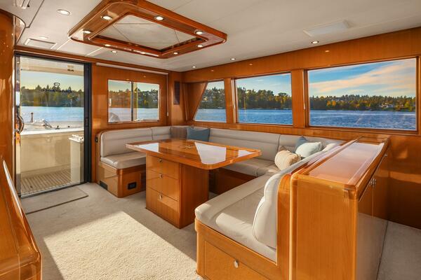 Up two steps forward are the spacious and open Galley to port and Bar area to starboard with sturdy aircraft style port and starboard doors with retractable screens for access to the exterior side decks and an inside stair access to the sky lounge via an open stairway. Forward the dining area has gloss finished handcrafted custom Makore cherry millwork. A custom dining table is mounted on a storage pedestal base with drawers below, a comfortable U-shaped upholstered seating area seats 6 comfortably and has storage drawers below. Frameless windows port and starboard allow voluminous amounts of natural light to fill the spaces for comfort while dining and entertaining. Overhead is the custom headliner with a and task lighting combined with indirect lighting.
