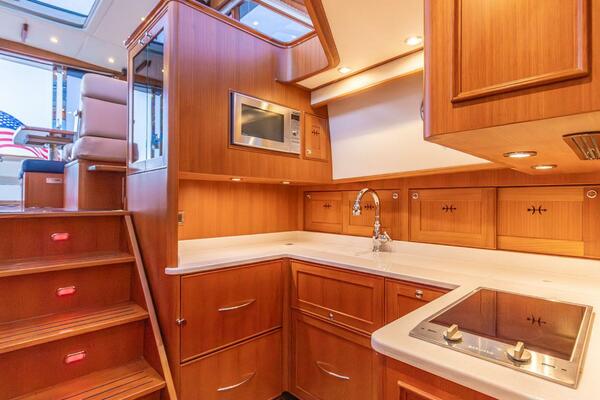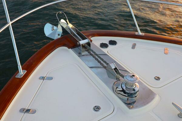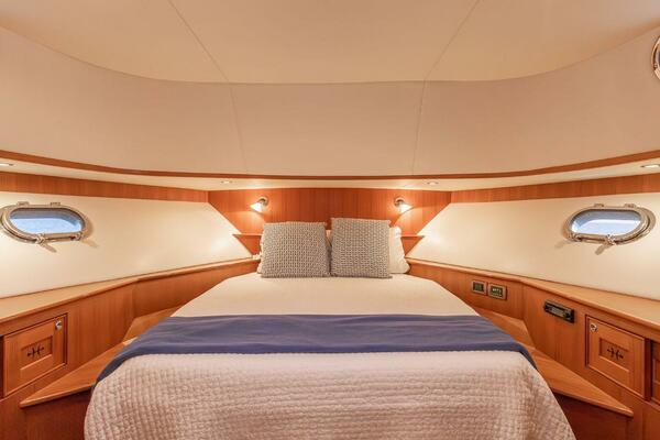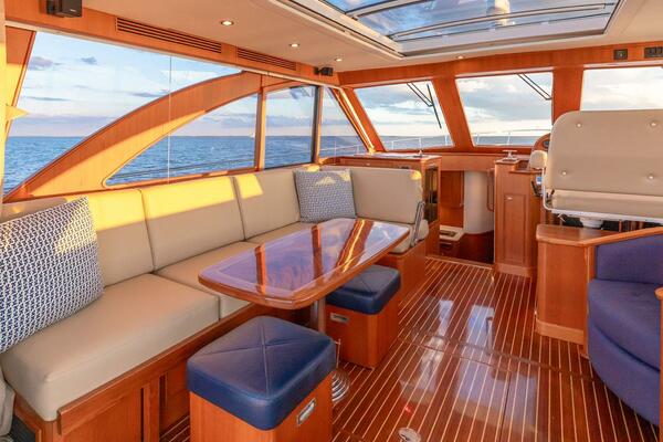 Additional innovative features include: pantry with laundry and wine bottle storage accessed behind the stairs; five electric opening windows and an enormous electric moonroof in the salon; electric up/down double companion settee with convertible backrest across from helm; aft deck refrigeration; wide swim platform with super yacht steps leading up each side and three joystick docking stations – all making for a uniquely comfortable and functional owner-operated yacht.