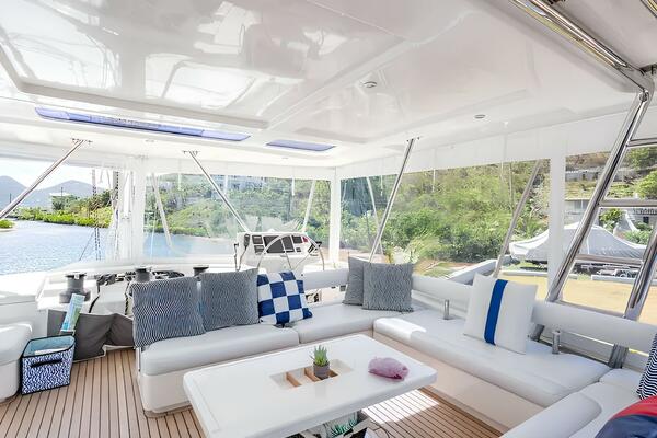 Step onto the swim platform of the 2014 Leopard 58 “ANNEX,” and you immediately feel the scale, luxury, and meticulous care that set this privately owned, non-charter flagship apart. Wide transom steps with hot/cold shower access lead you into the expansive aft cockpit—an inviting outdoor living area with a teak dining table for ten, plush seating, and seamless indoor–outdoor flow. This area has clearly benefited from the yacht’s recent interior refinishing and updated soft goods, giving it a fresh, modern feel that reflects the vessel’s continual professional upkeep.