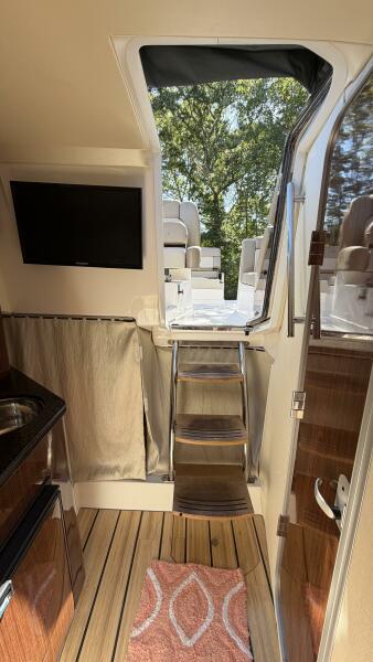 The cabin offers sleeping for 4 (including a queen-size mid-berth and convertible dinette), a full galley (with microwave, cooktop, fridge, and sink), and an enclosed head with shower—larger than many in its class.