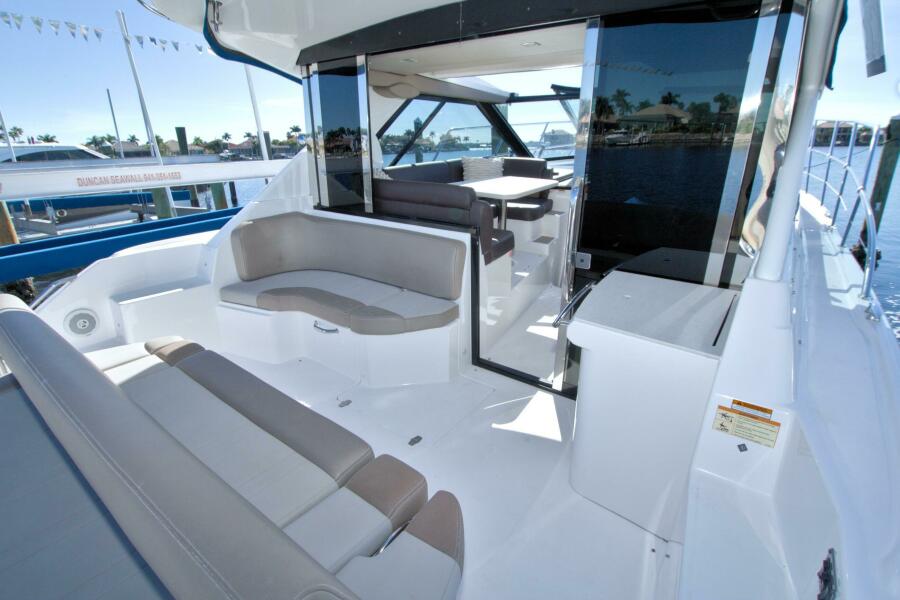 The 46 Sport Coupe is known for its innovative single-level cockpit, retractable hardtop, and seamless indoor-outdoor layout. The salon doors fully open to create a massive entertainment area ideal for sunsets, gatherings, and relaxing at anchor.