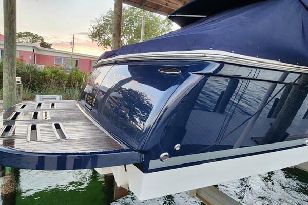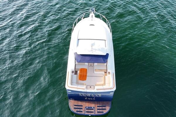 The moment you step aboard the teak inlaid fiberglass swim platform on this beautiful flag blue hull, you feel the full beam of welcoming cockpit seating and signature soft Marine Mat flooring. With an on center transom gate and teak handrail, Tiara has made a statement of style and safety for up to 8 guests.