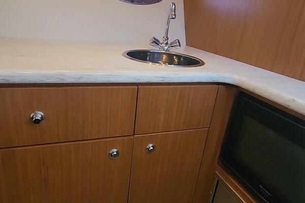 One level main deck access to the enclosed helm area offers seating and table portside with a Kenyon electric grill sink combination bar with refrigerator to starboard. The hardtop has a manual sliding sunroof with superior sliding track and lock for letting the sunshine in or keeping the weather out.