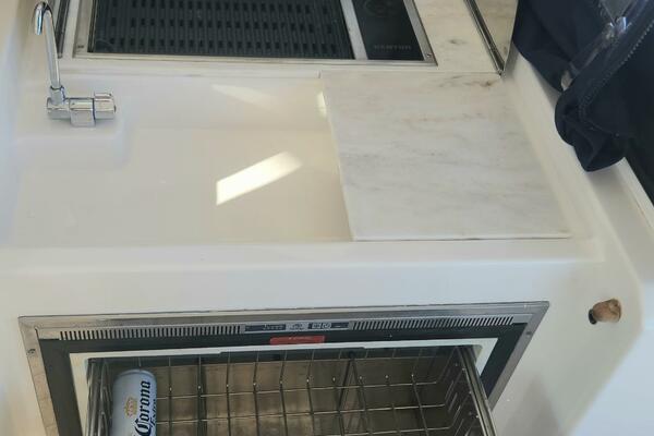 - Midship enclosed Wet Bar with Kenyon Grill, Fridge, Counter Space w. cabinet and storage for grill tools, plates and utensils. All trimmed in SS and marble within the canvas enclosure.