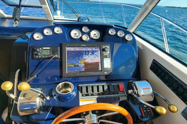 Twin Crusader 6.0L gas engines are controlled with Tiara signature gold accent levers. The captain's chair is comfortable and wide with adjustability fore and aft with a molded nonslip foot panel.