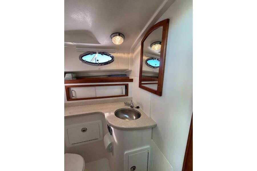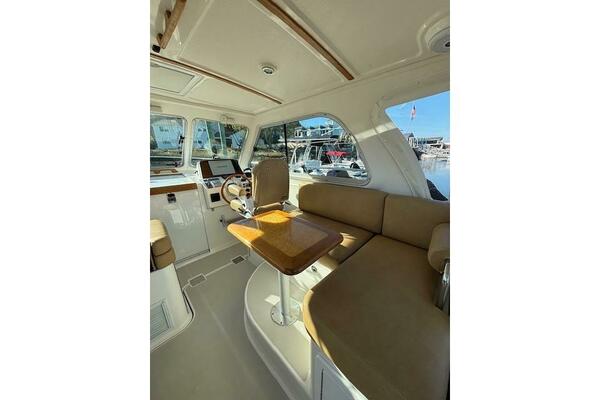 The Back Cove 30 has a resin infused, deep-vee hull with propeller recess and standard trim tabs which result in a quiet and comfortable ride. With her standard 320 horsepower six-cylinder diesel, she will cruise at 20 knots and top out at 25. With the added power of the optional engine, she will cruise at 25 knots. Precision maneuverability provided by a standard bow thruster provides confidence at the dock. Below decks, her comfortable V-berth and head unit with pull-out shower faucet make overnighting on board a dream.