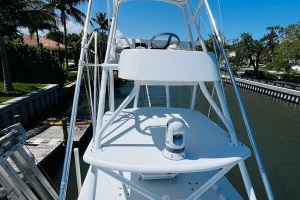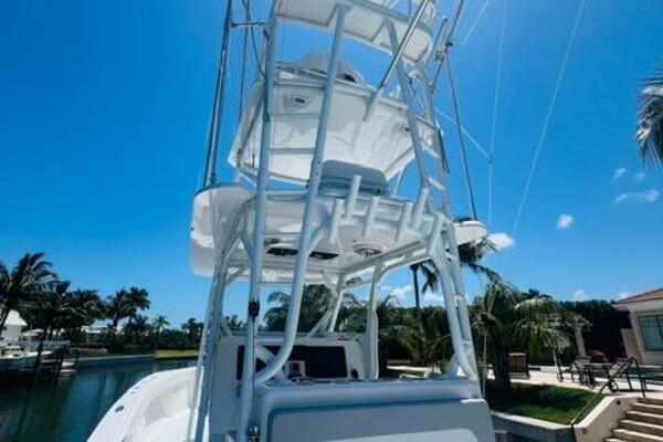 2015 Billfish 39 Custom CC boat with tower against clear blue sky.