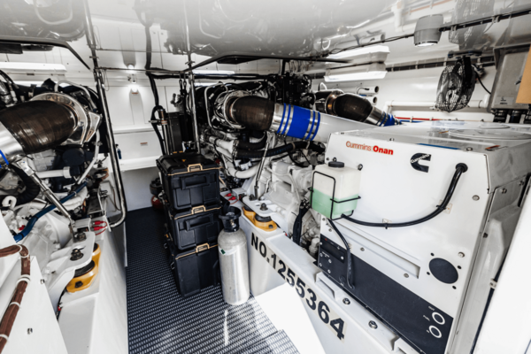 Inside, the salon and galley offer a bright, open layout with large windows that fill the space with natural light. Below deck, a central companionway leads to four staterooms and three heads. A stacked washer and dryer is conveniently located in the hallway. The open flybridge features excellent 360-degree visibility, rod holders aft, generous forward seating with storage beneath and ⅔ Isinglass enclosure.